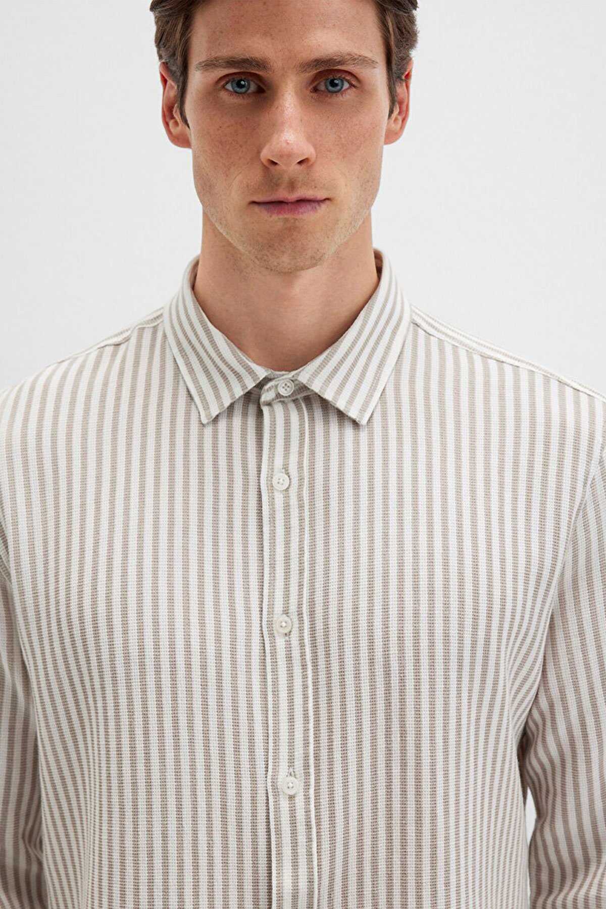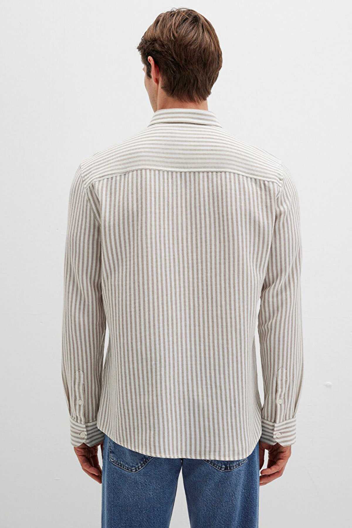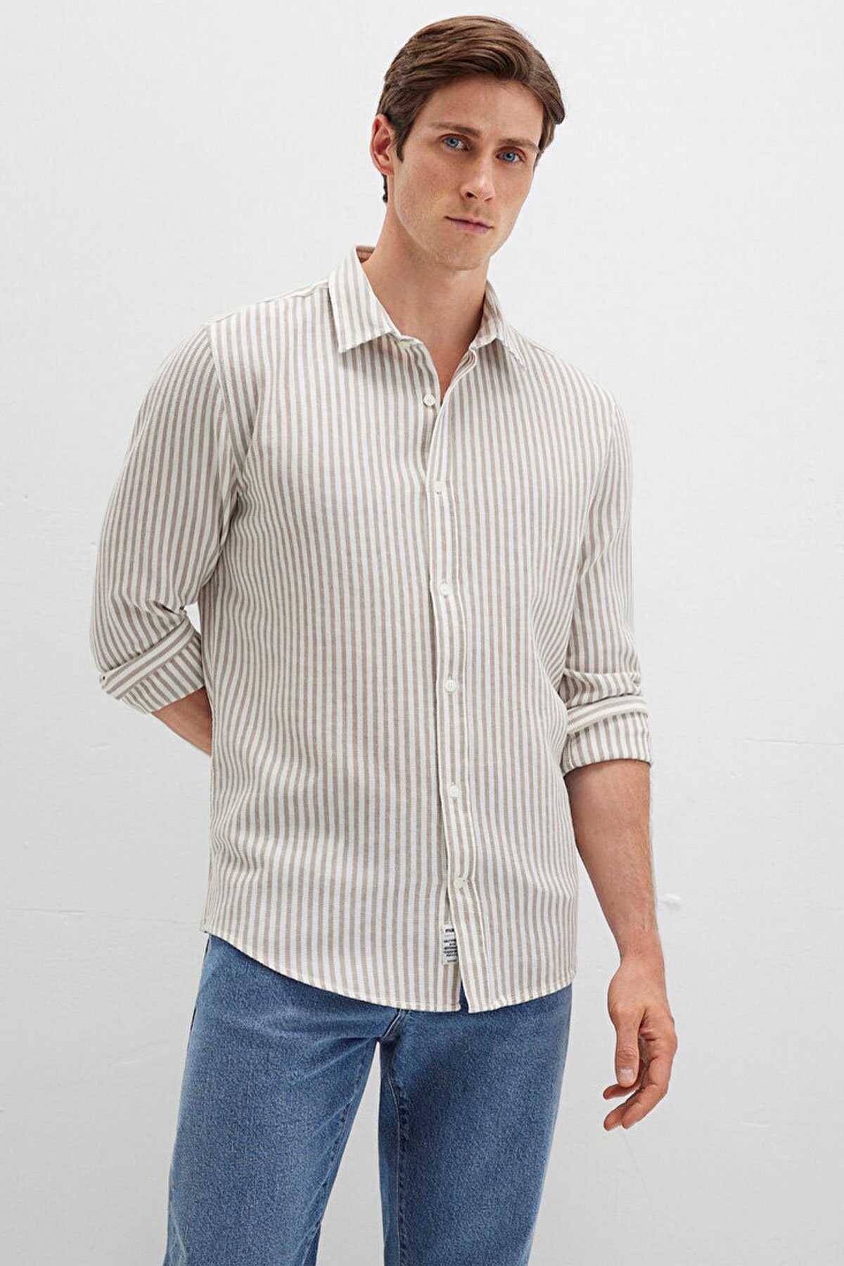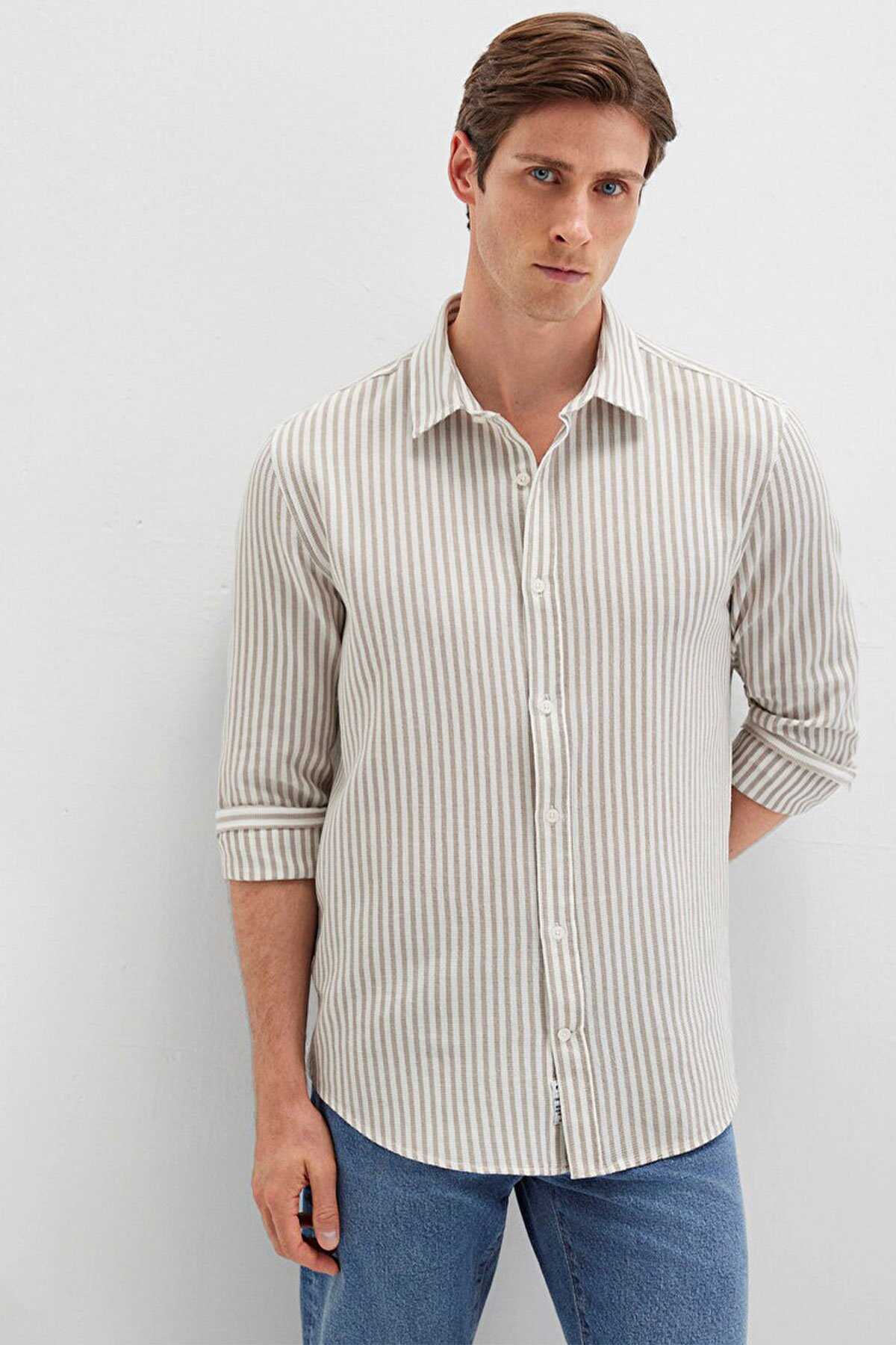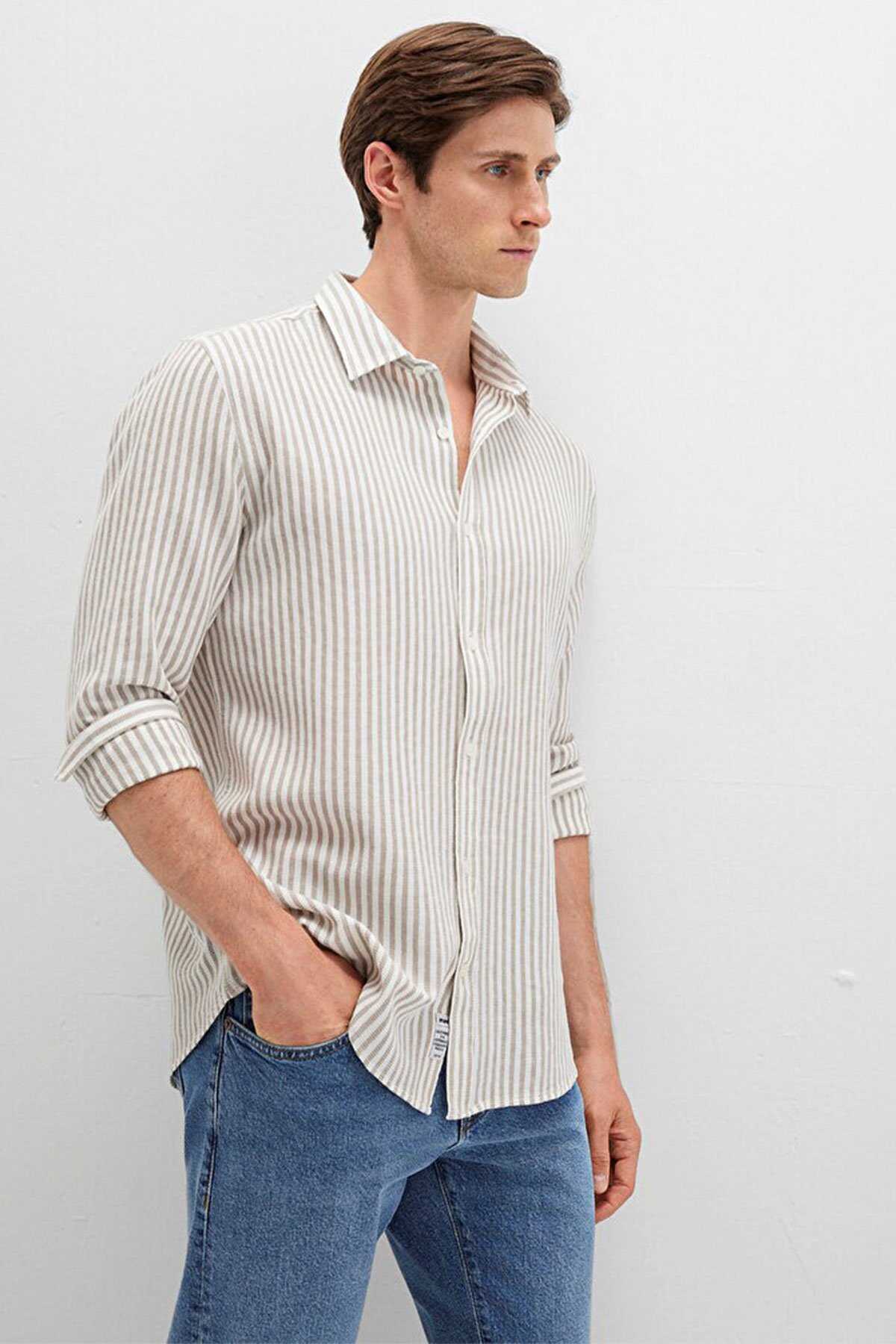 Mavi nin erkek koleksiyonundan Çizgili Bej Gömlek. - Slim Fit Dar Kesim - Ürün Kodu: 0211692-90940 - Kumaş Bilgileri - %100 Pamuk - Manken Ölçüleri - Jean: Bel: 31 Boy: 31 Üst: L - Boy: 187 cm Bel: 80 cm Göğüs: 99 cm Kalça: 94 cm - Menşei: Türkiye