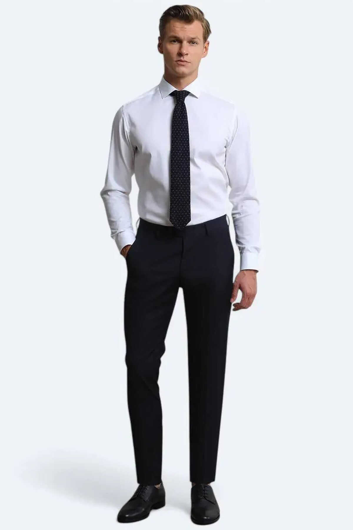 Pantolon-Desen: Düz-Line: Klasik-Paça: Klasik Paça-Fit: Slim Fit-Cep: Yan Cep-Karışım: %54 Polyester %44 Yün %2 Elastan-Sezon: Sezonsuz-Manken: Boy: 187 cm Göğüs: 98 cm Bel: 78 cm Basen: 96 cm Beden: 32-Üretim Yeri: Mısır-Article: PANT-454