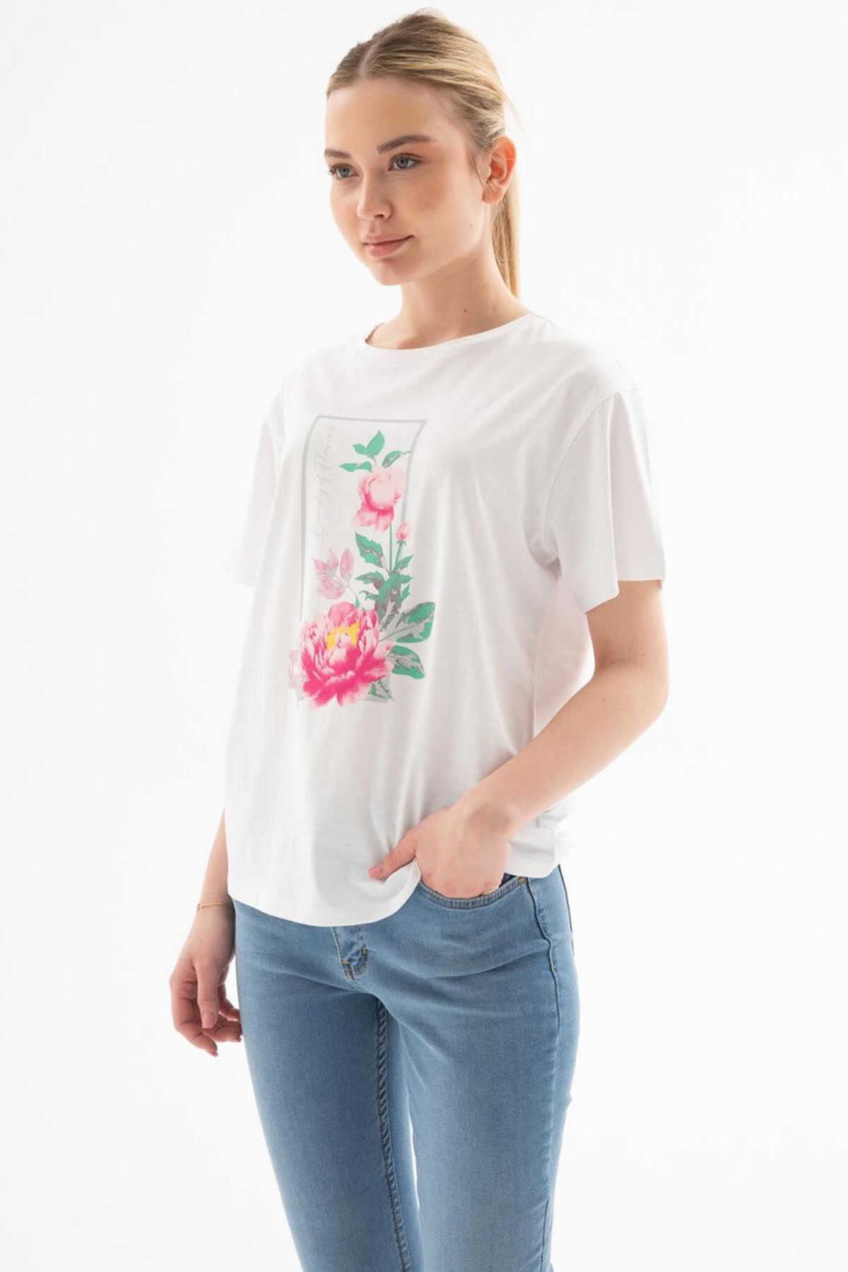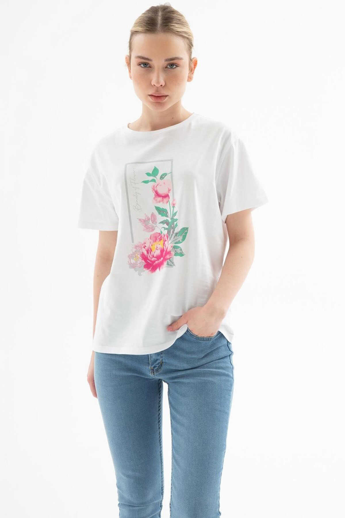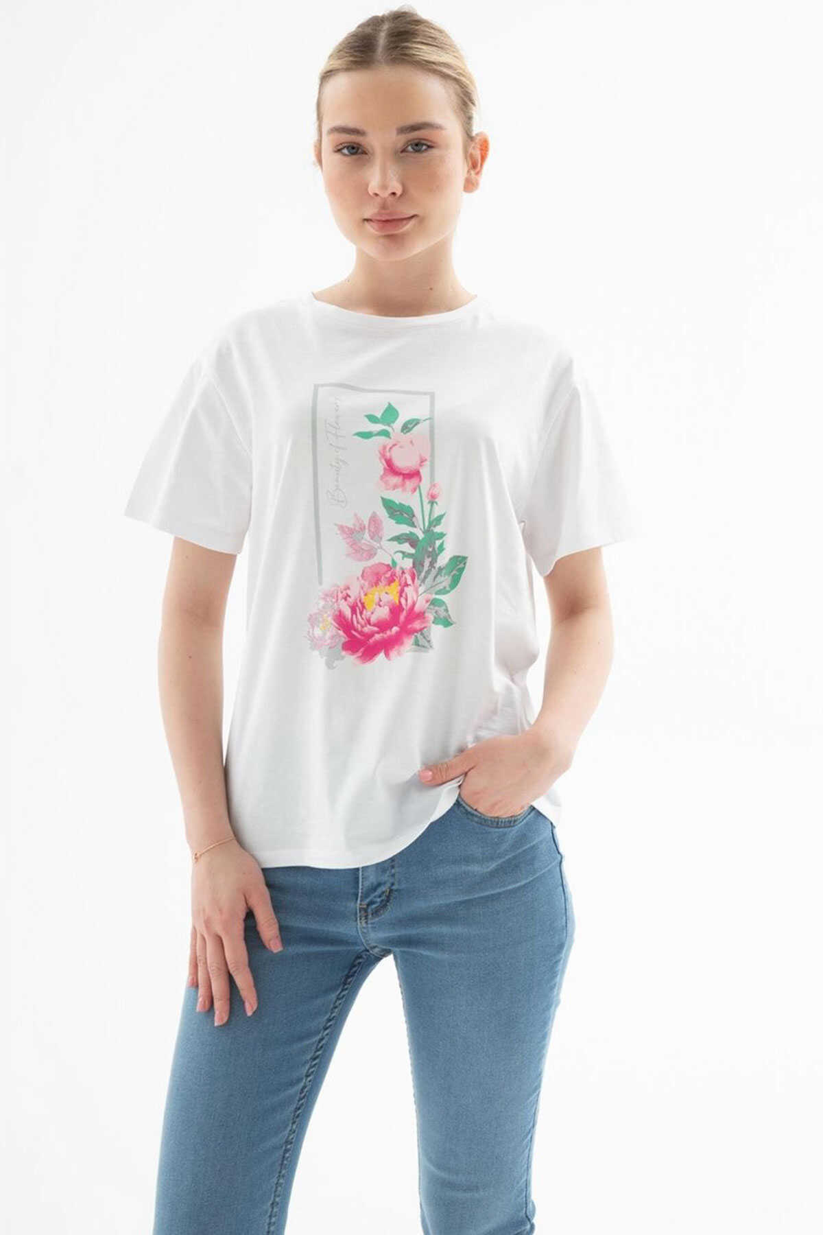 Baskılı T-Shirt-Model Ölçüleri: Boy:1.70 Göğüs:90 Bel:68 Basen:90-Mankenin üzerindeki ürün S2836 bedendir.-Cinsiyet: Kadın-Kalıp: Standart-Yaka Tipi: Bisiklet Yaka-Desen: Baskılı-Kol Tipi: Kısa Kol-Kumaş: %100 Pamuk-Ürün Tipi: Örme-Ürün Kodu: 25Y0122K1-Menşei: Türkiye