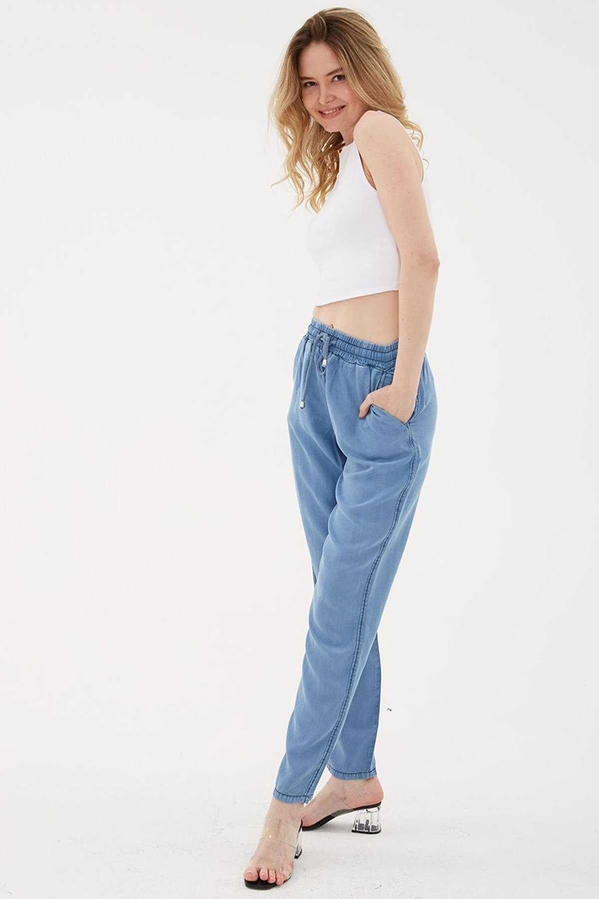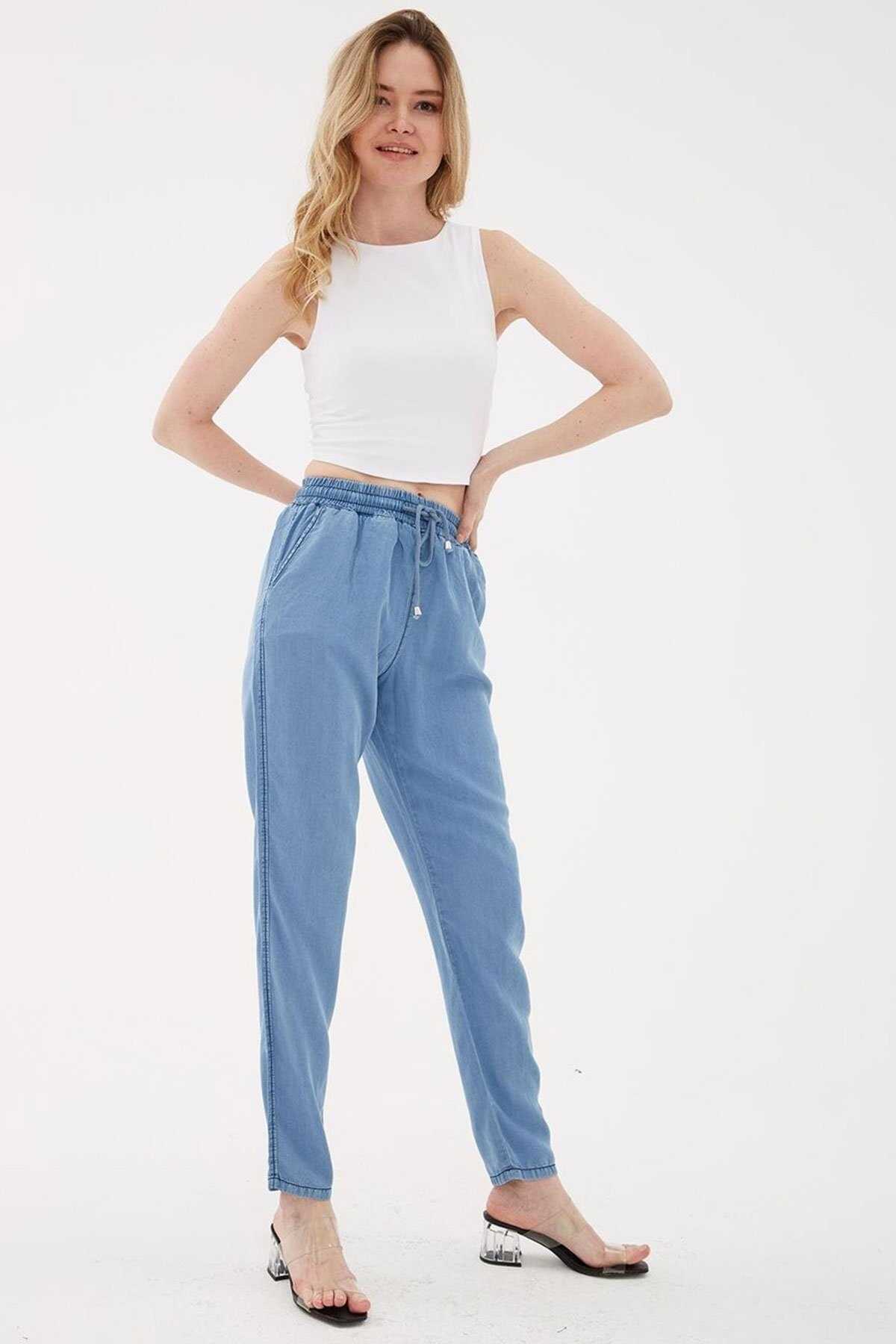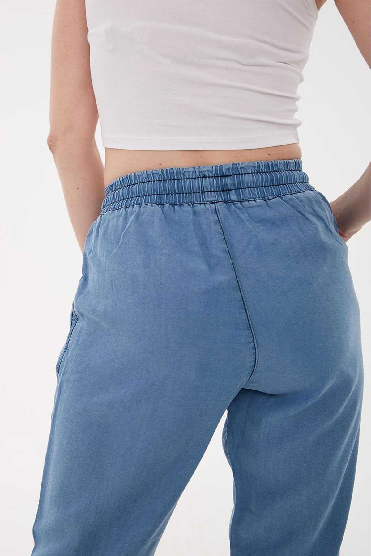 Beli Bağlamalı Denim Pantolon-Model Ölçüleri: Boy:1.70 Göğüs:90 Bel:68 Basen:90-Mankenin üzerindeki ürün S2836 bedendir.-Cinsiyet: Kadın-Kalıp: Rahat-Bel Tipi: Lastikli-Kumaş: %100 Tencel-Ürün Tipi: Denim-Ürün Kodu: 25Y0657K1-Menşei: Türkiye