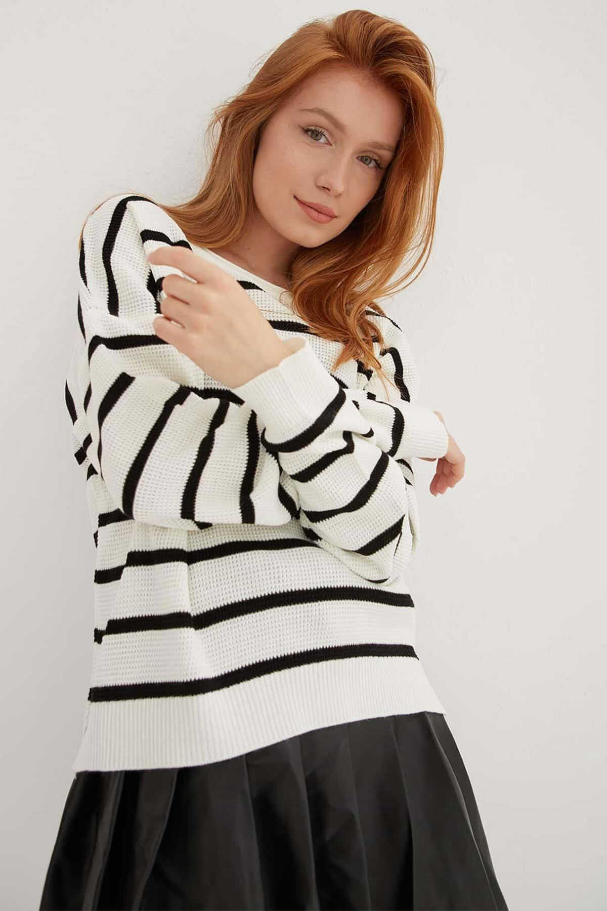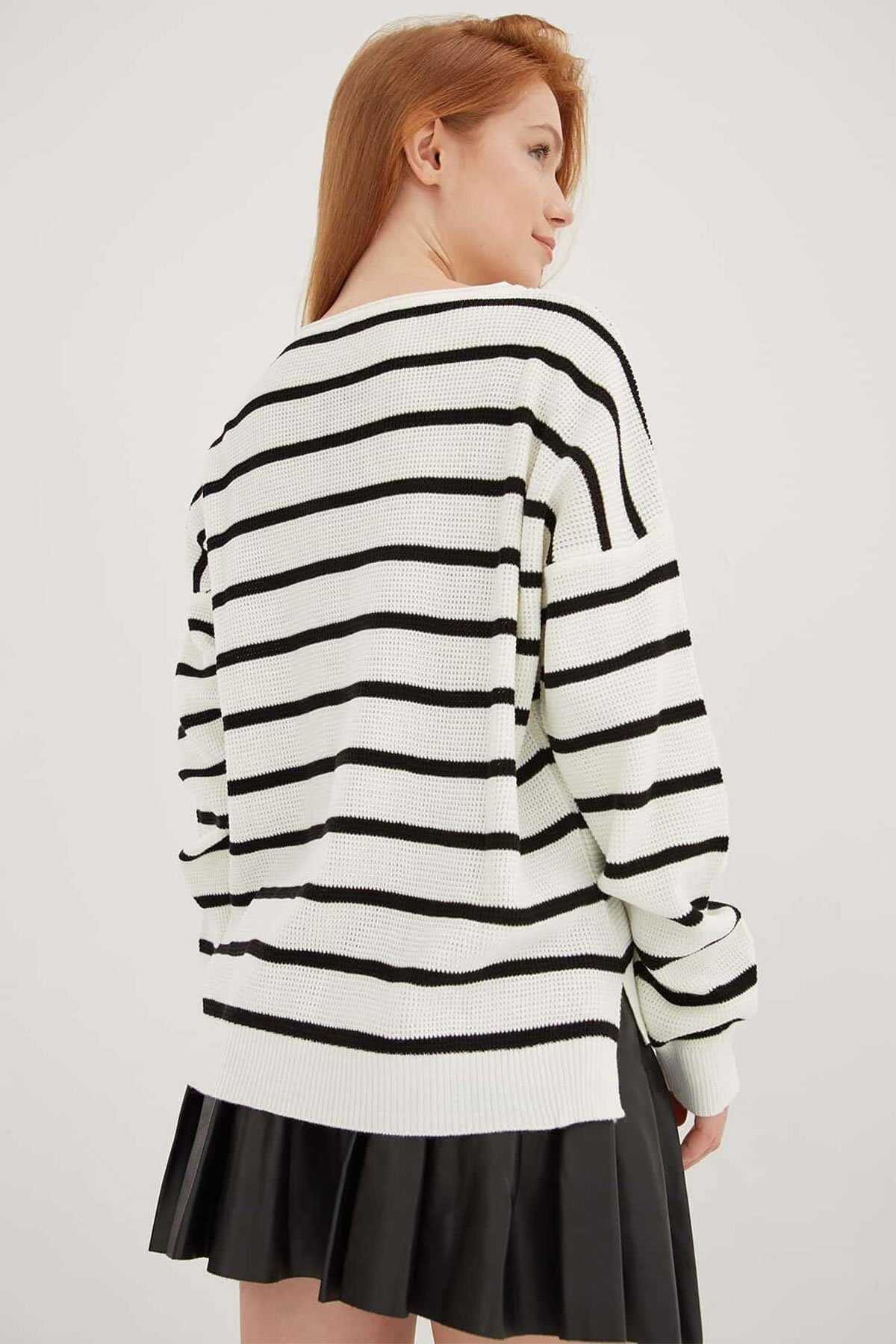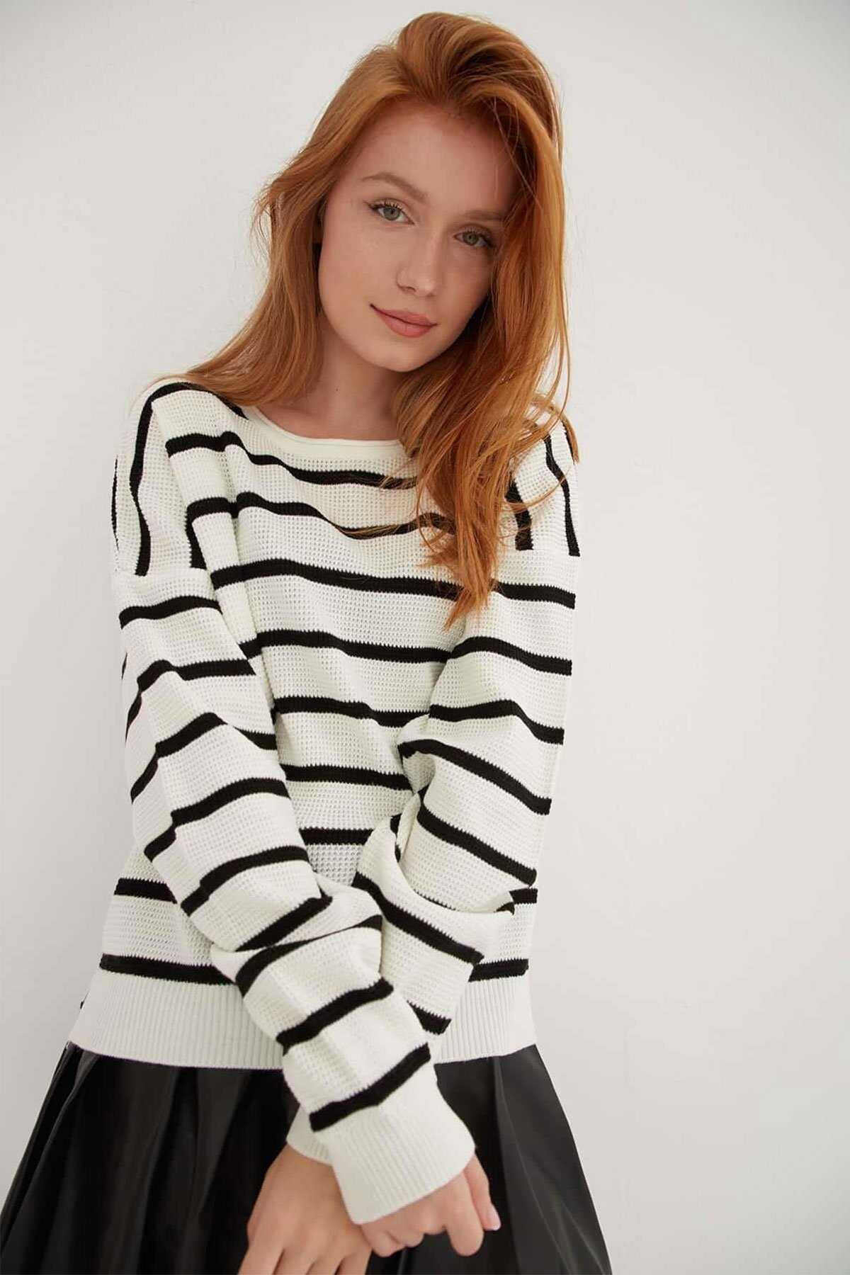 Kadın Çizgili Kazak 25K0477K1 Ekru