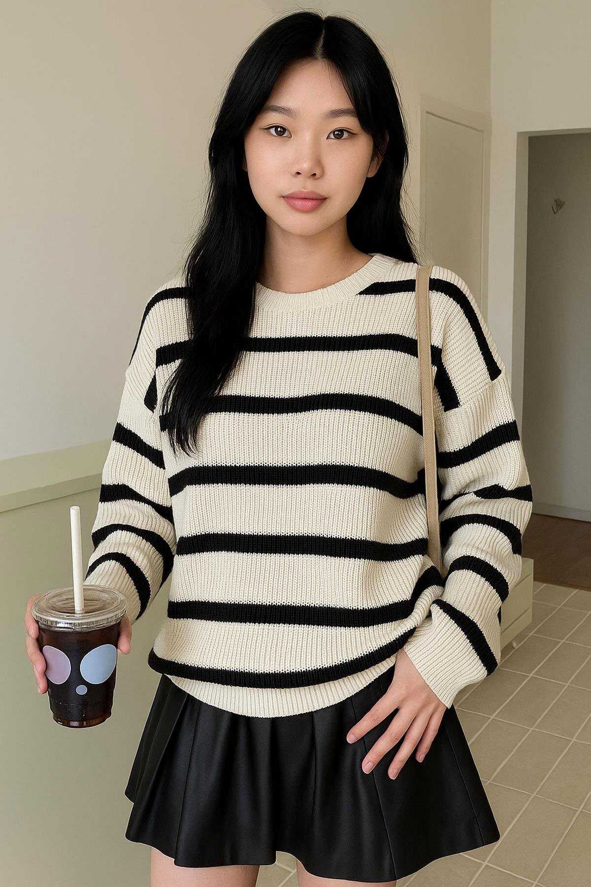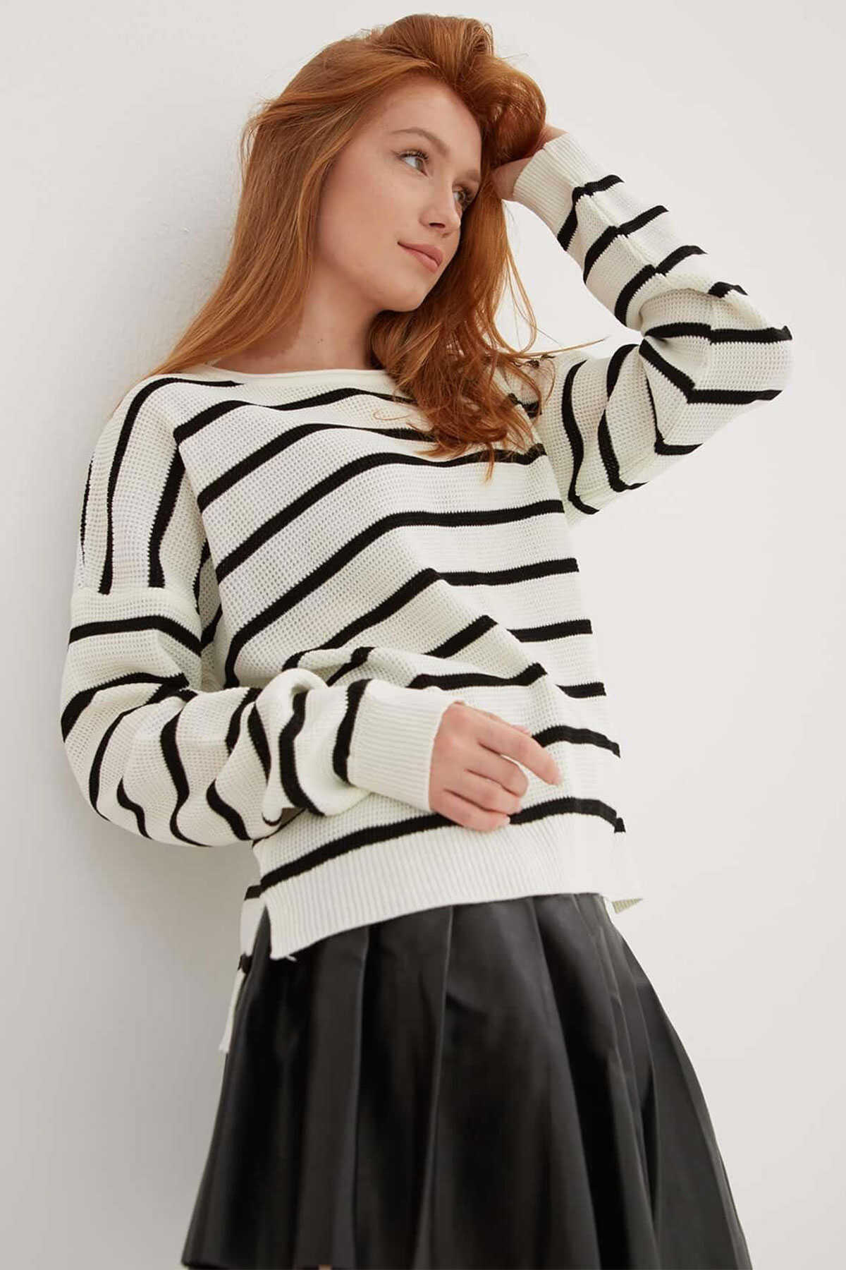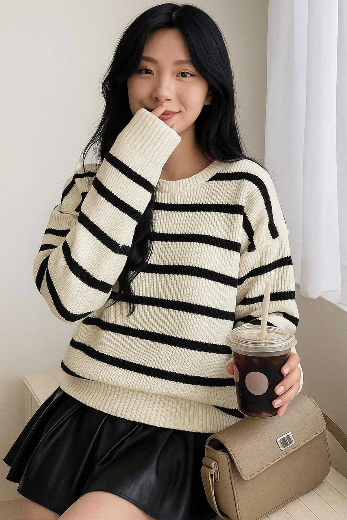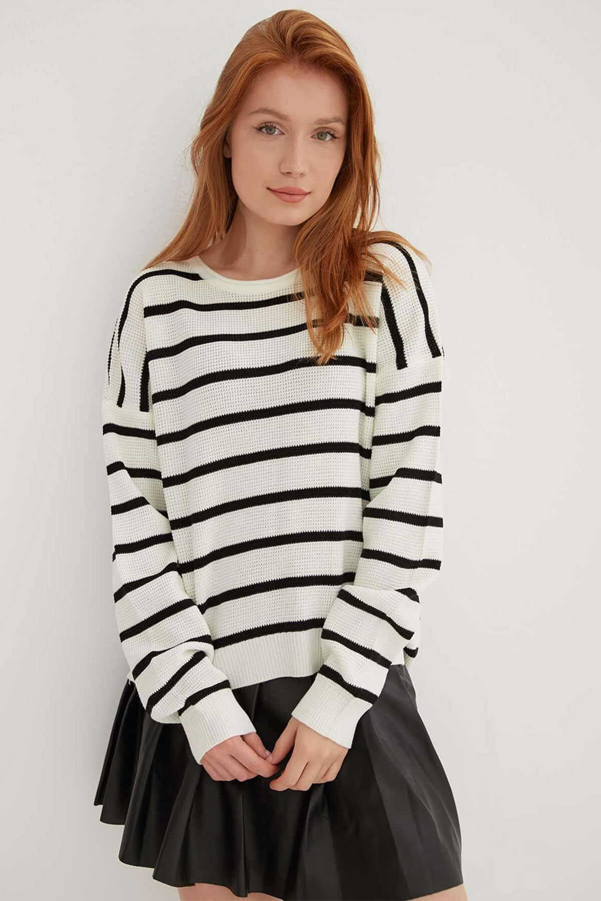 Kadın Çizgili Kazak 25K0477K1 Ekru