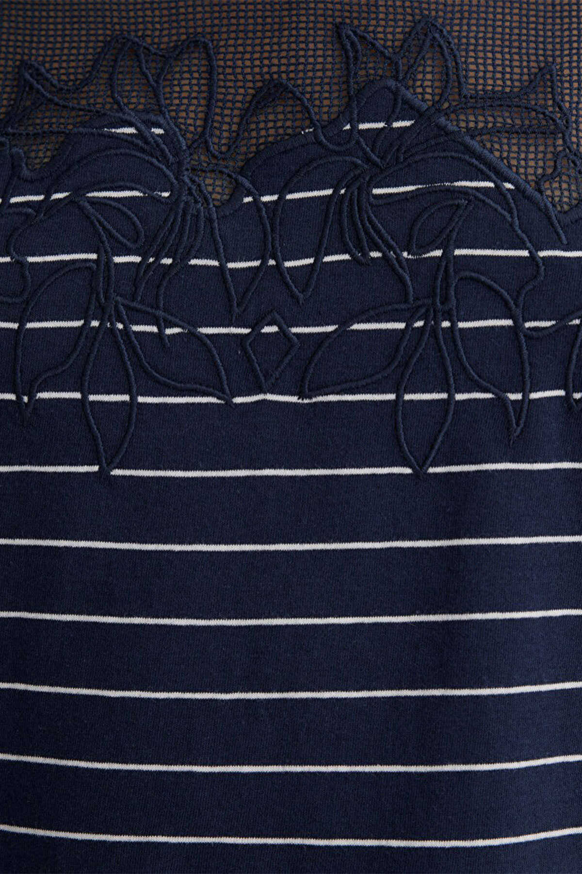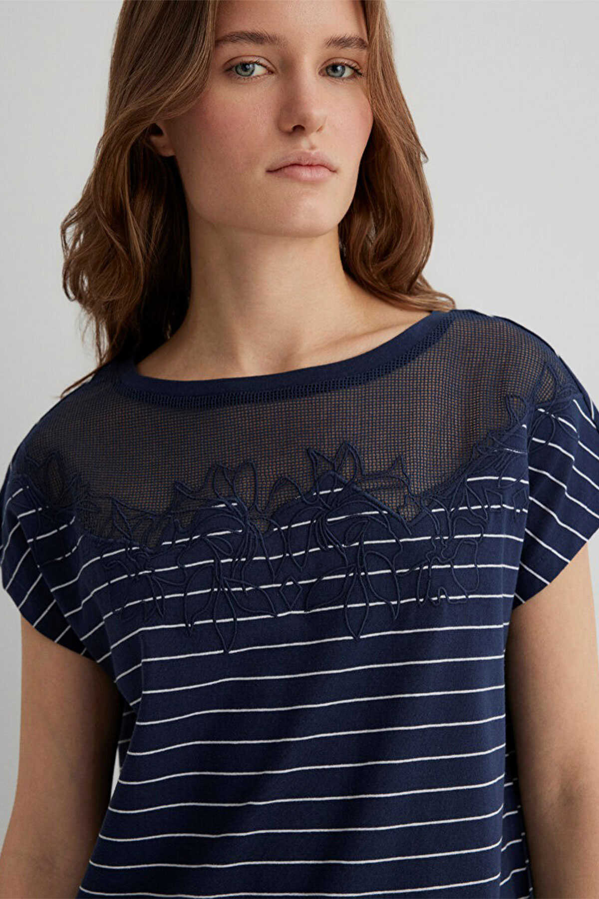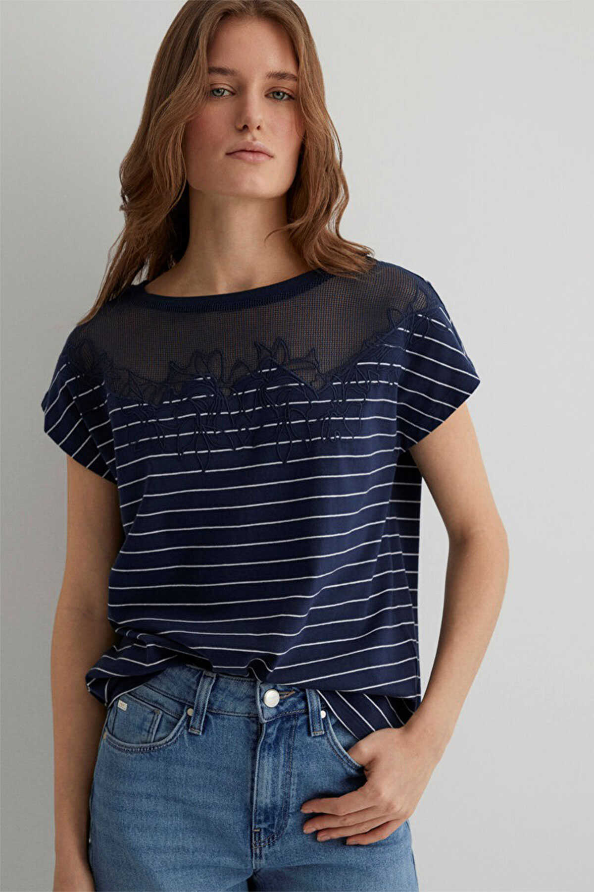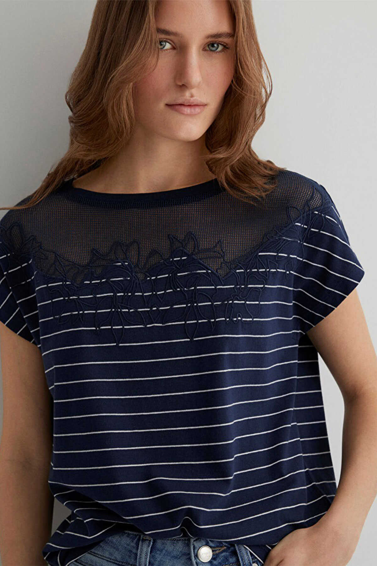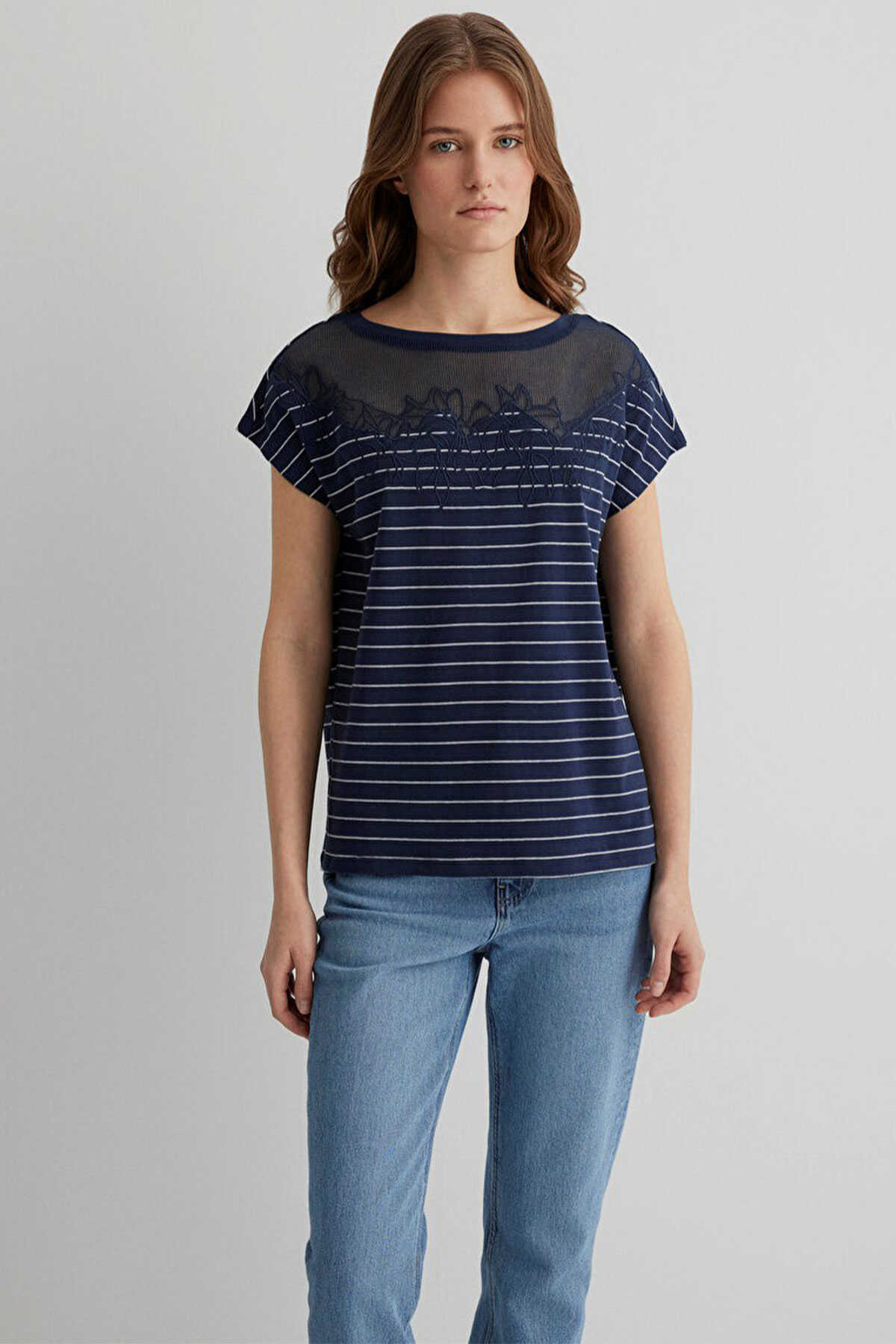 Mavi nin kadın koleksiyonundan Dantel Detaylı Lacivert Çizgili Tişört.-Ürün Kodu: 1612306-85500-Kumaş Bilgileri-%100 Pamuk-Manken Ölçüleri-Jean: Bel: 26 Boy: 32 Üst: S-Boy: 174 cm Bel: 58 cm Göğüs: 78 cm Kalça: 87 cm-Menşei: Türkiye