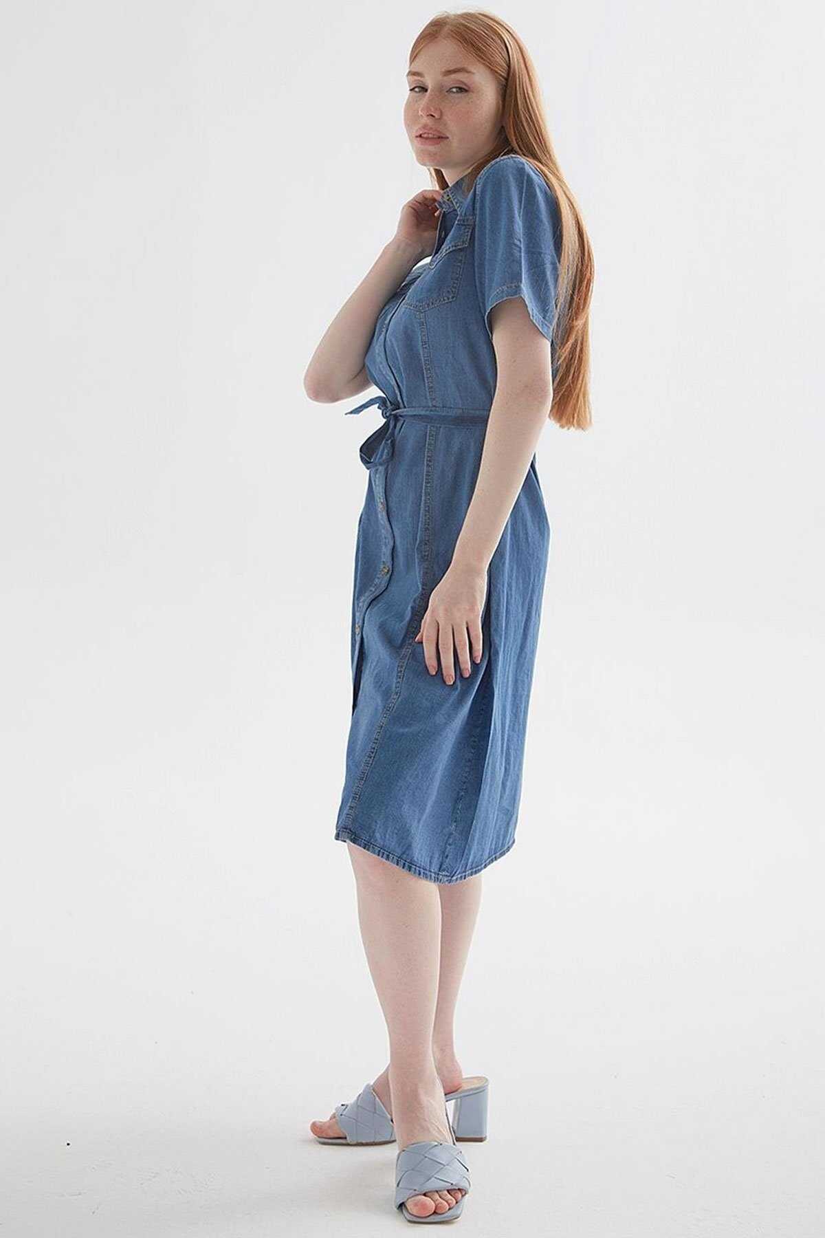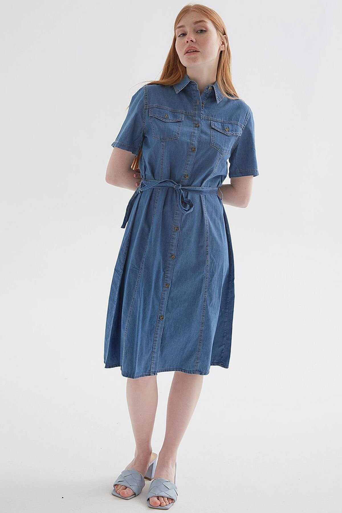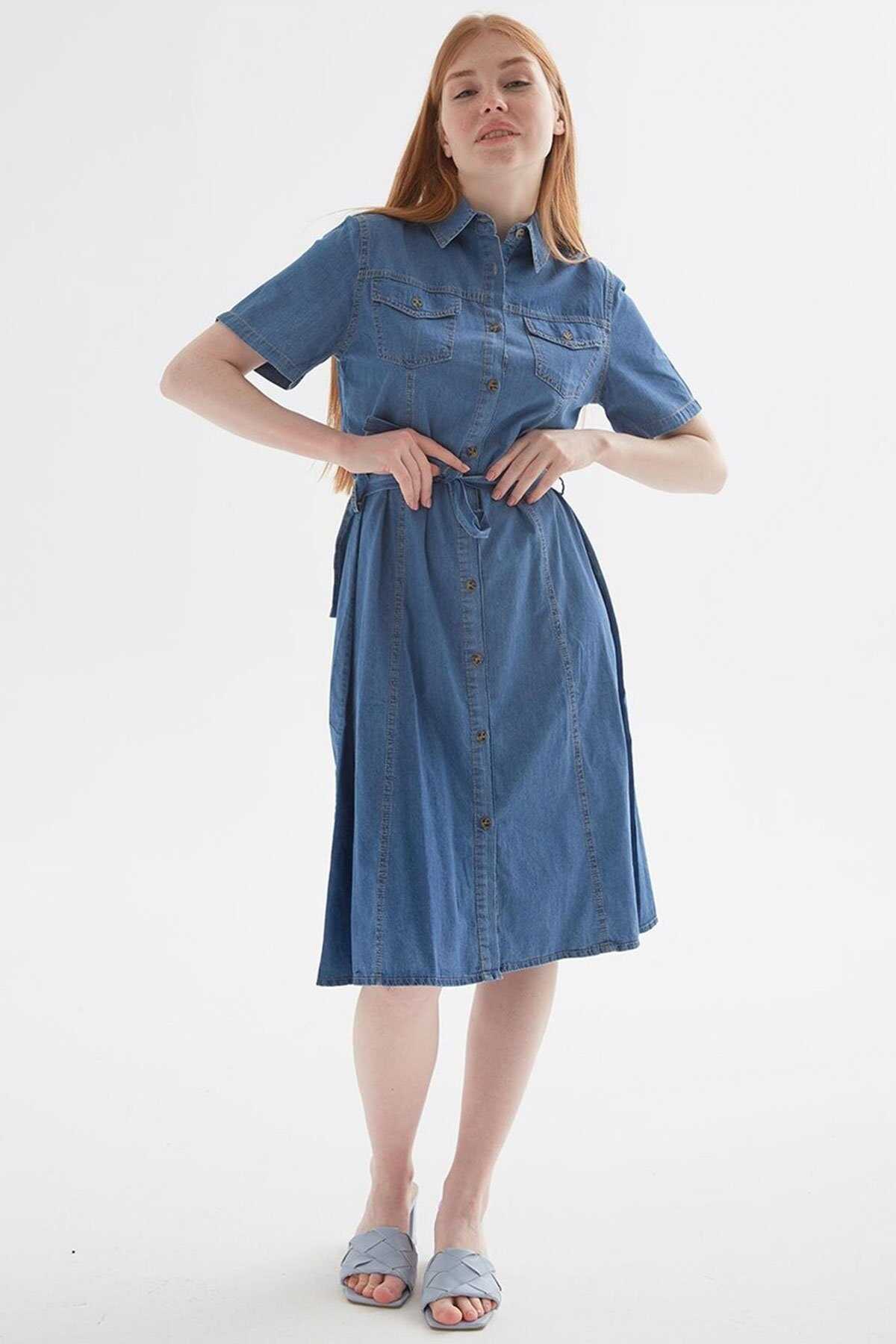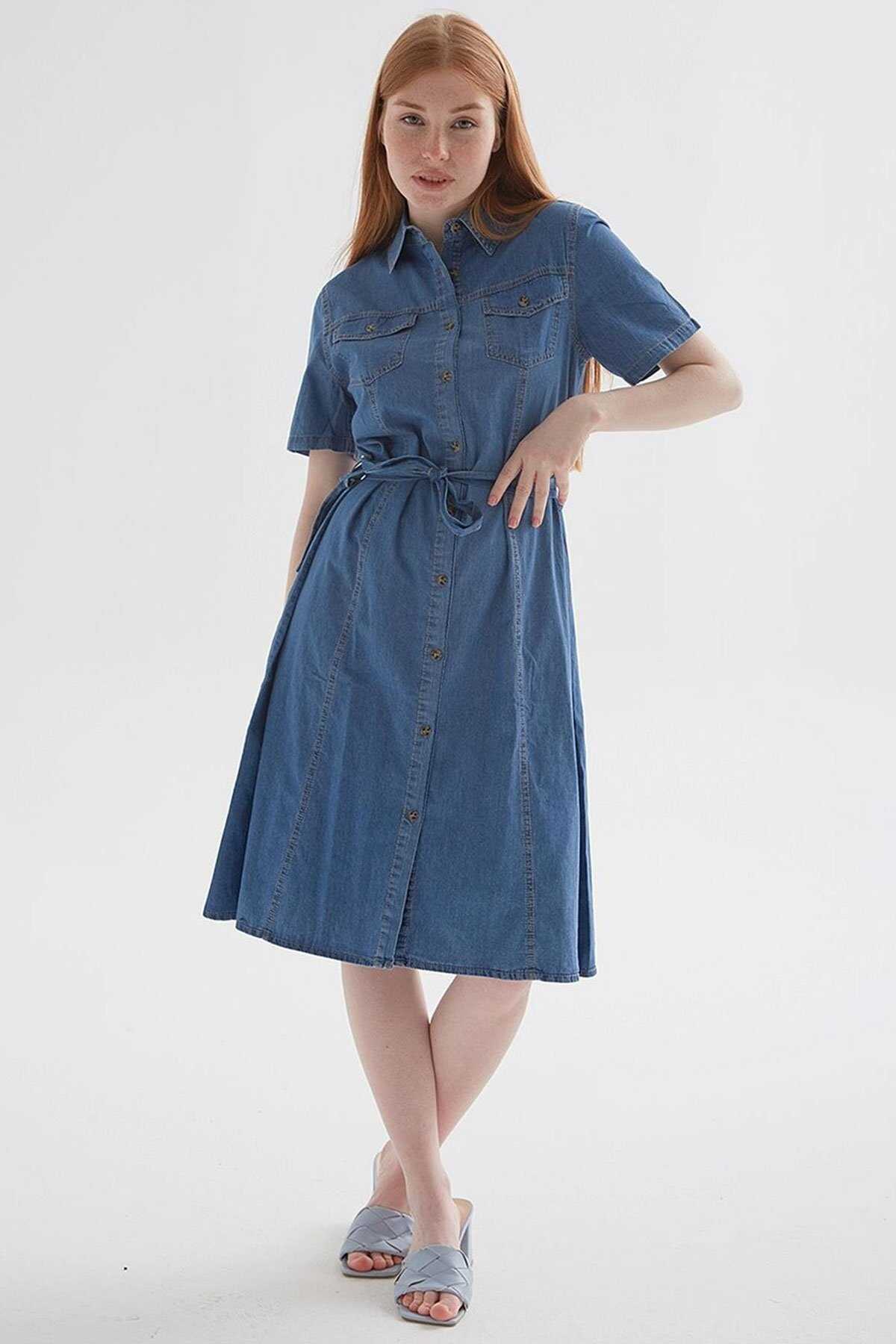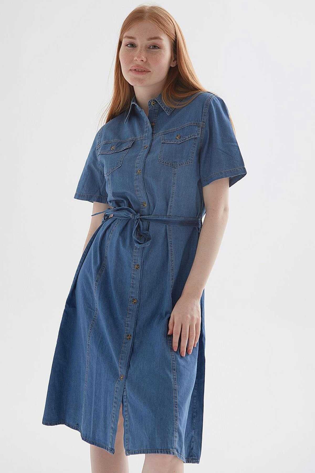 Denim Elbise-Model Ölçüleri: Boy:1.70 Göğüs:90 Bel:68 Basen:90-Mankenin üzerindeki ürün S2836 bedendir.-Cinsiyet: Kadın-Kalıp: Standart-Yaka Tipi: Gömlek Yaka-Asta: Astarsız-Kol Tipi: Kısa Kol-Kumaş: %100 Pamuk-Ürün Tipi: Denim-Ürün Kodu: 25Y0108K1-Menşei: Türkiye