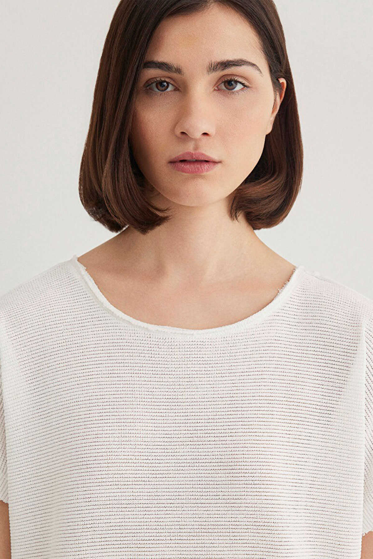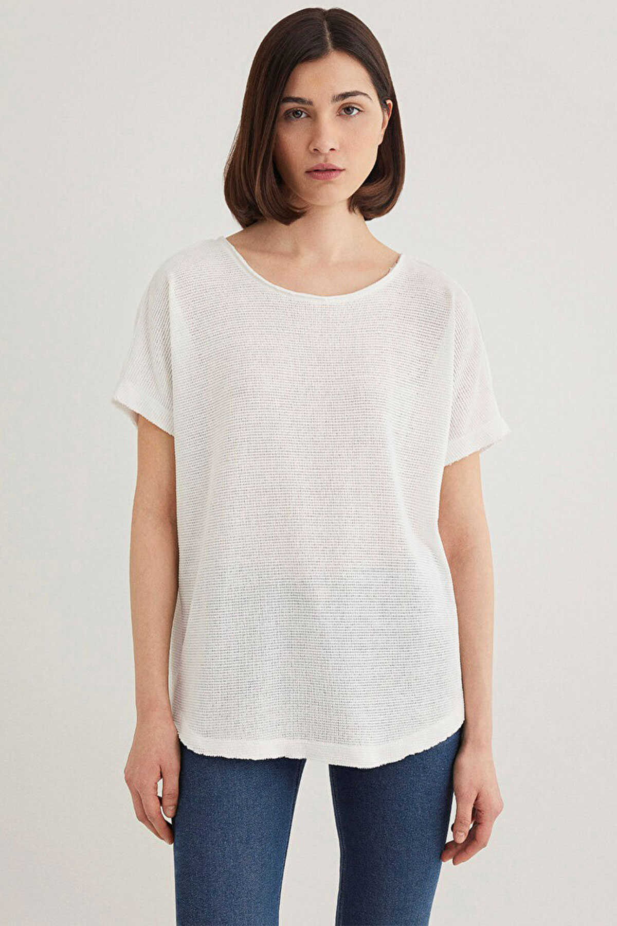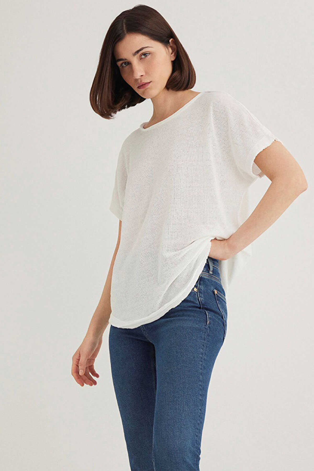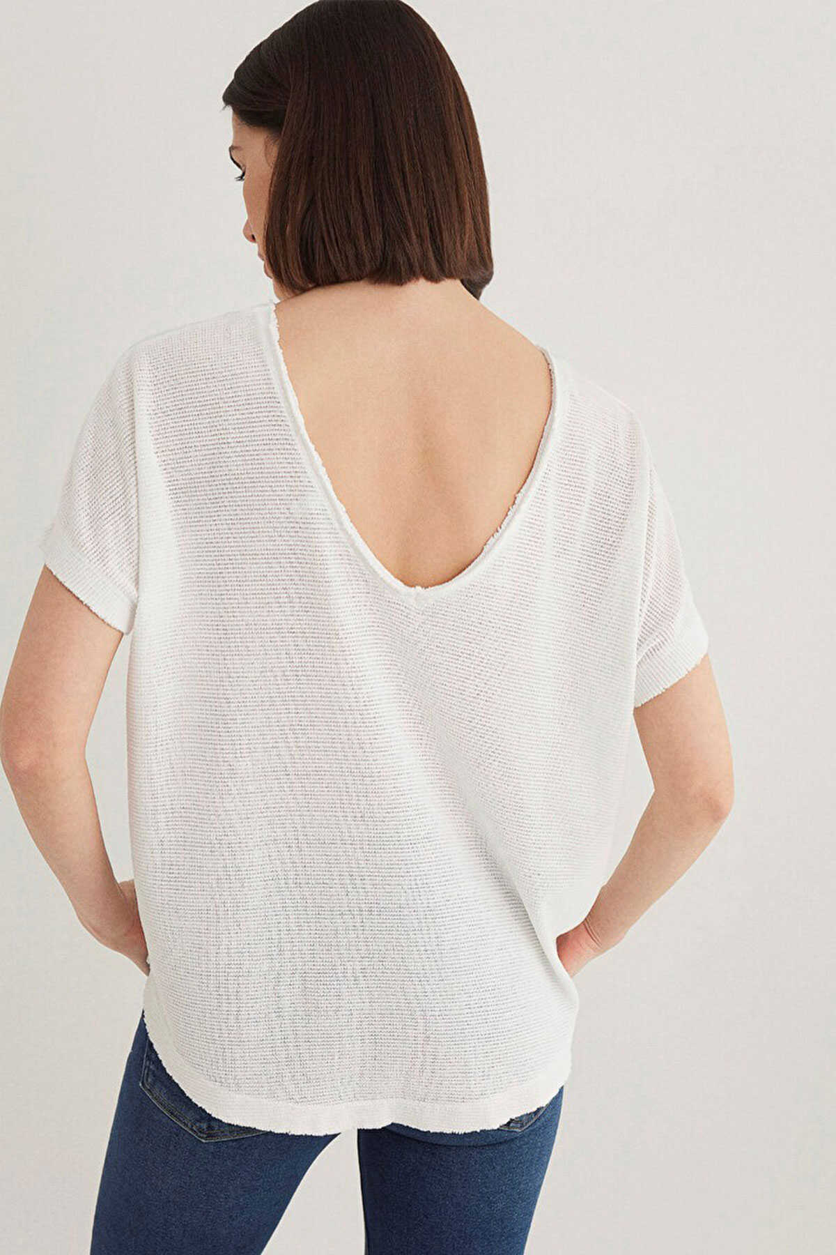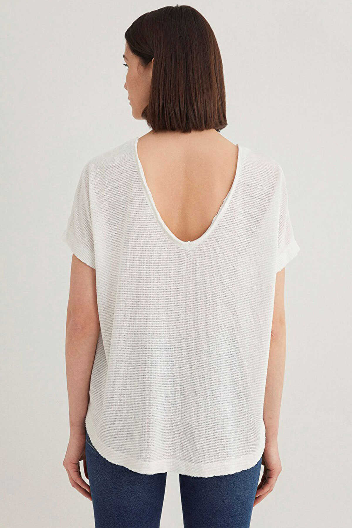 Oversize geniş kesim. -Kısa kol. -Sırtında V yaka detay. -Yakasında kollarında ve etek ucunda raw dikiş detayları. -Dokulu Beyaz Basic Tişört.-Ürün Kodu: 167311-81964-Kumaş Bilgileri-%100 Polyester-Manken Ölçüleri-Jean: Bel: 26 Boy: 32 Üst: S-Boy: 177 cm Bel: 59 cm Göğüs: 76 cm Kalça: 89 cm-Menşei: Türkiye