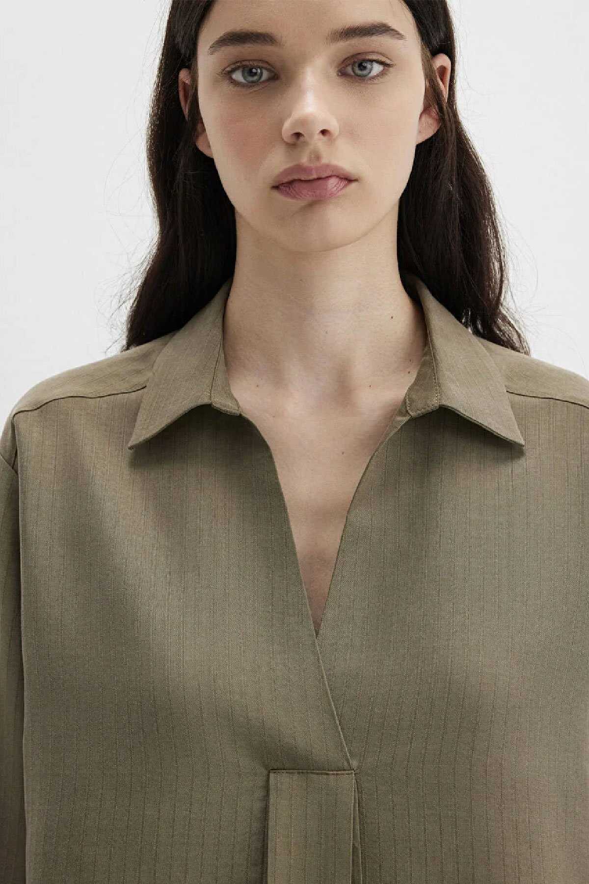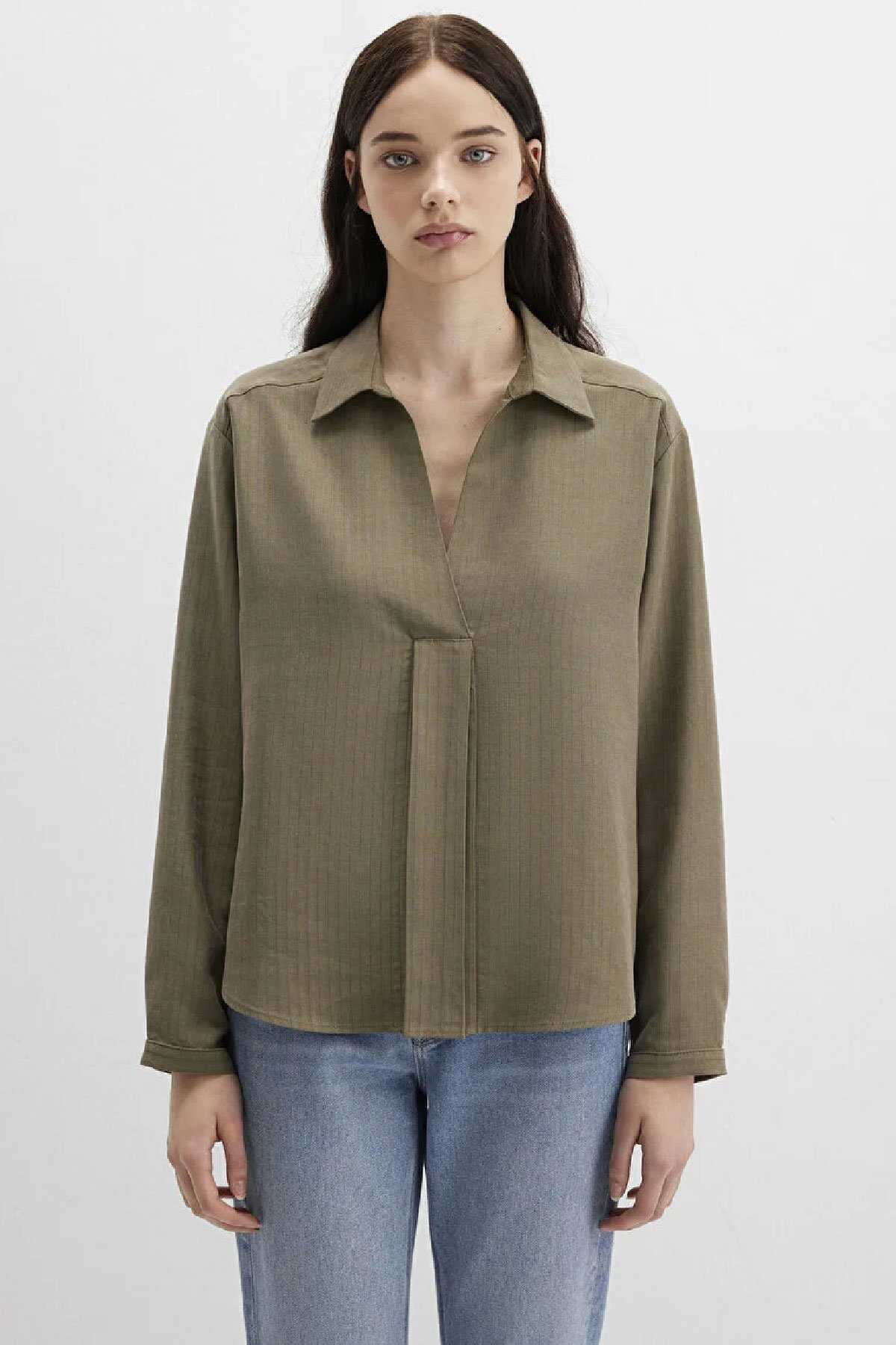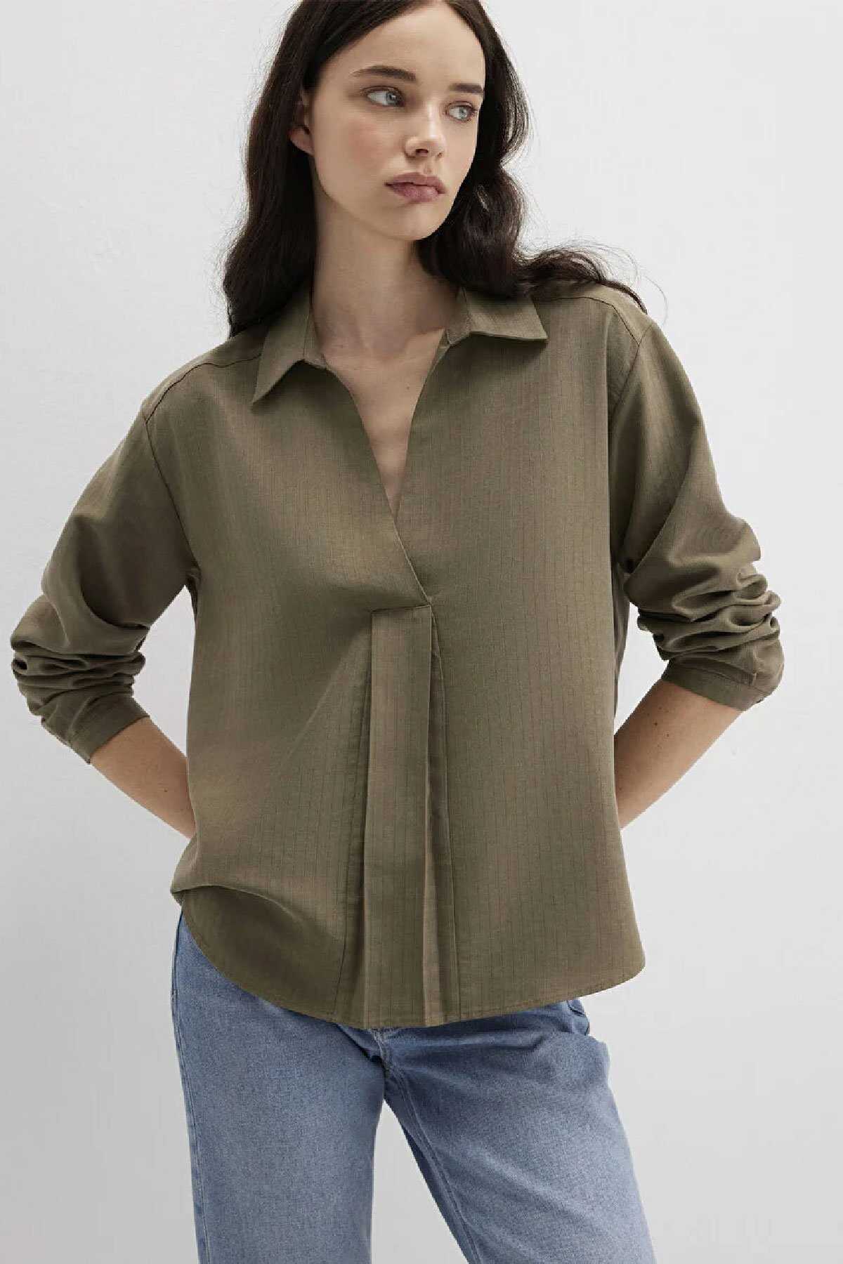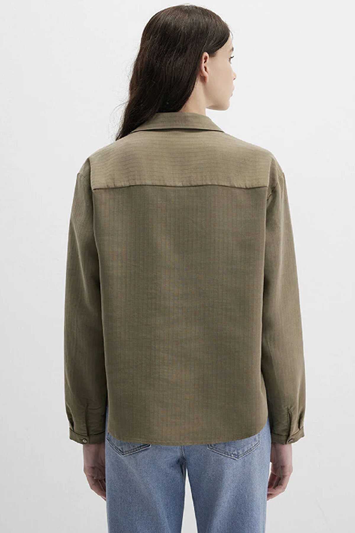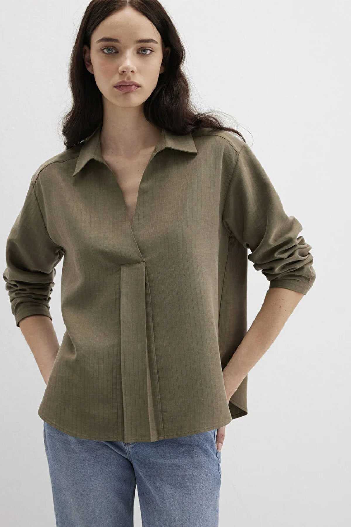 Mavi nin kadın koleksiyonundan Haki Tencel Karışımlı Bluz.-Ürün Kodu: 1211423-87538-Manken Ölçüleri-Jean: Bel: 26 Boy: 32 Üst: S-Boy: 181 cm Bel: 63 cm Göğüs: 88 cm Kalça: 93 cm-Menşei: Türkiye