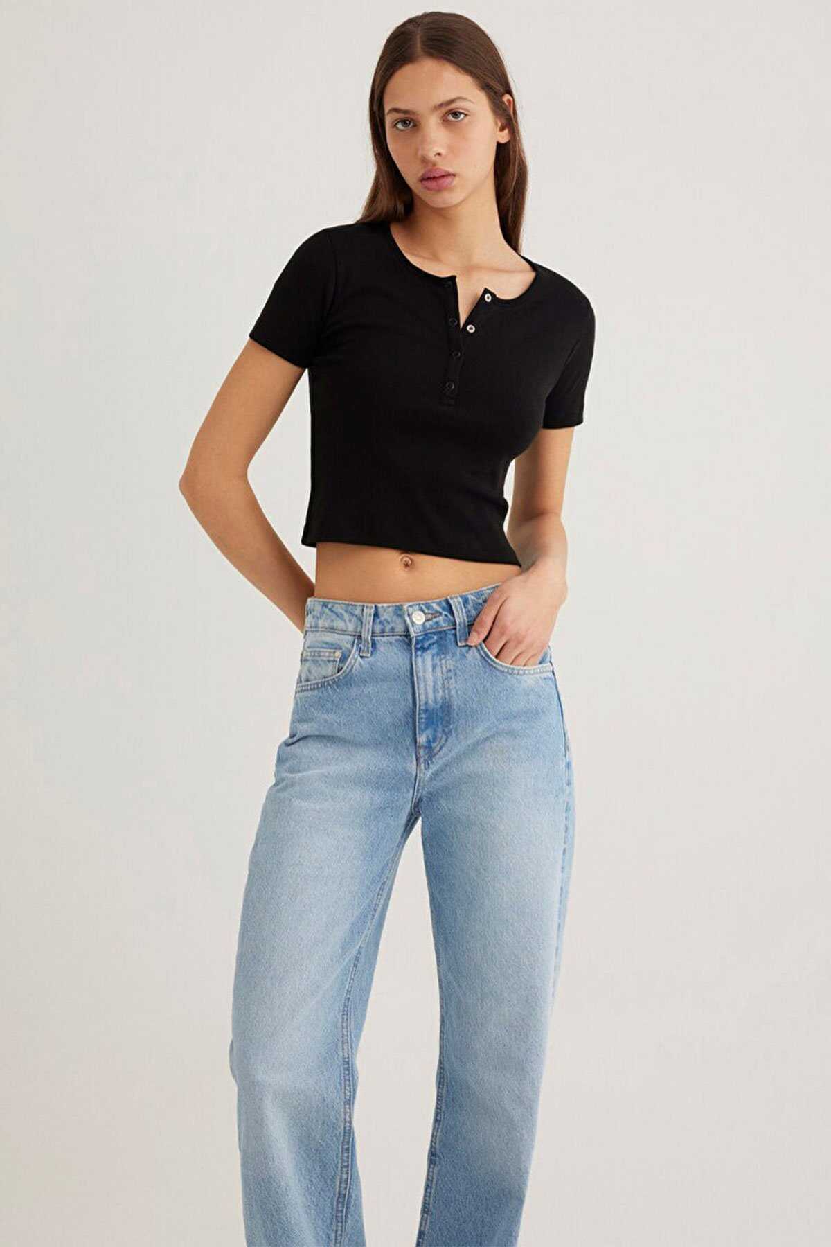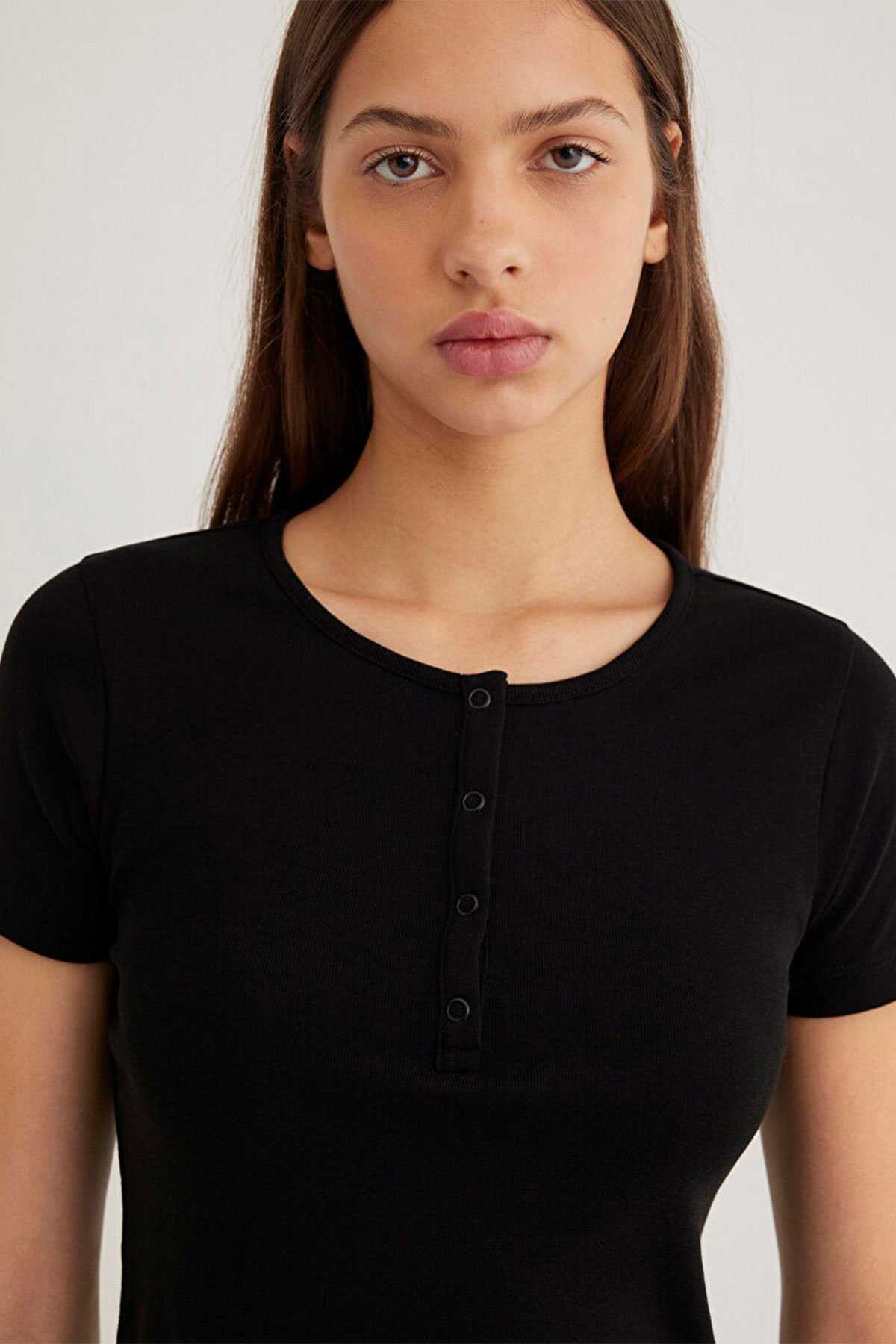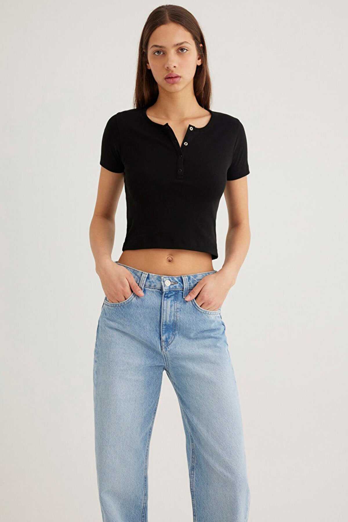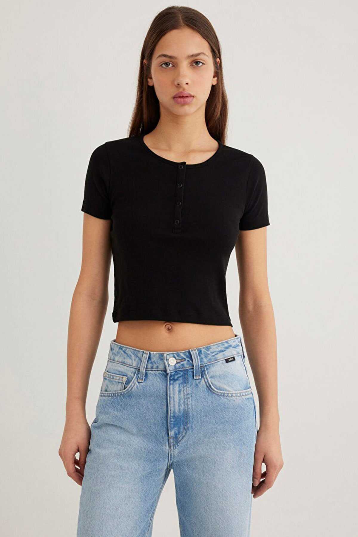 Yüzde yüz pamuk. -Crop kısa kesim. -V yaka. -Kısa kol. -Düğmeli Siyah Basic Tişört.-Ürün Kodu: 1611639-900-Kumaş Bilgileri-%100 Pamuk-Manken Ölçüleri-Jean: Bel: 26 Boy: 32 Üst: S-Boy: 177 cm Bel: 60 cm Göğüs: 79 cm Kalça: 87 cm-Menşei: Türkiye
