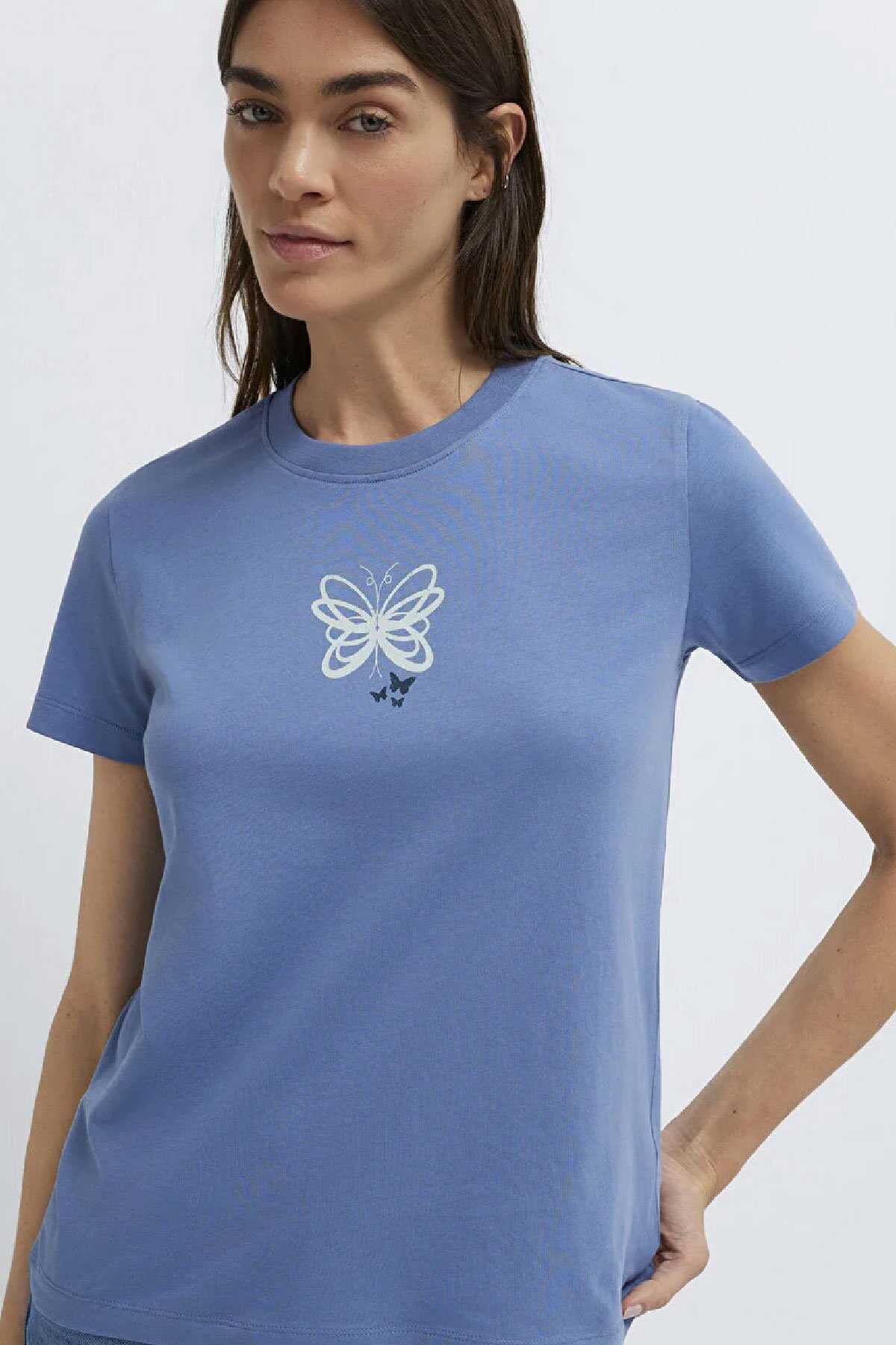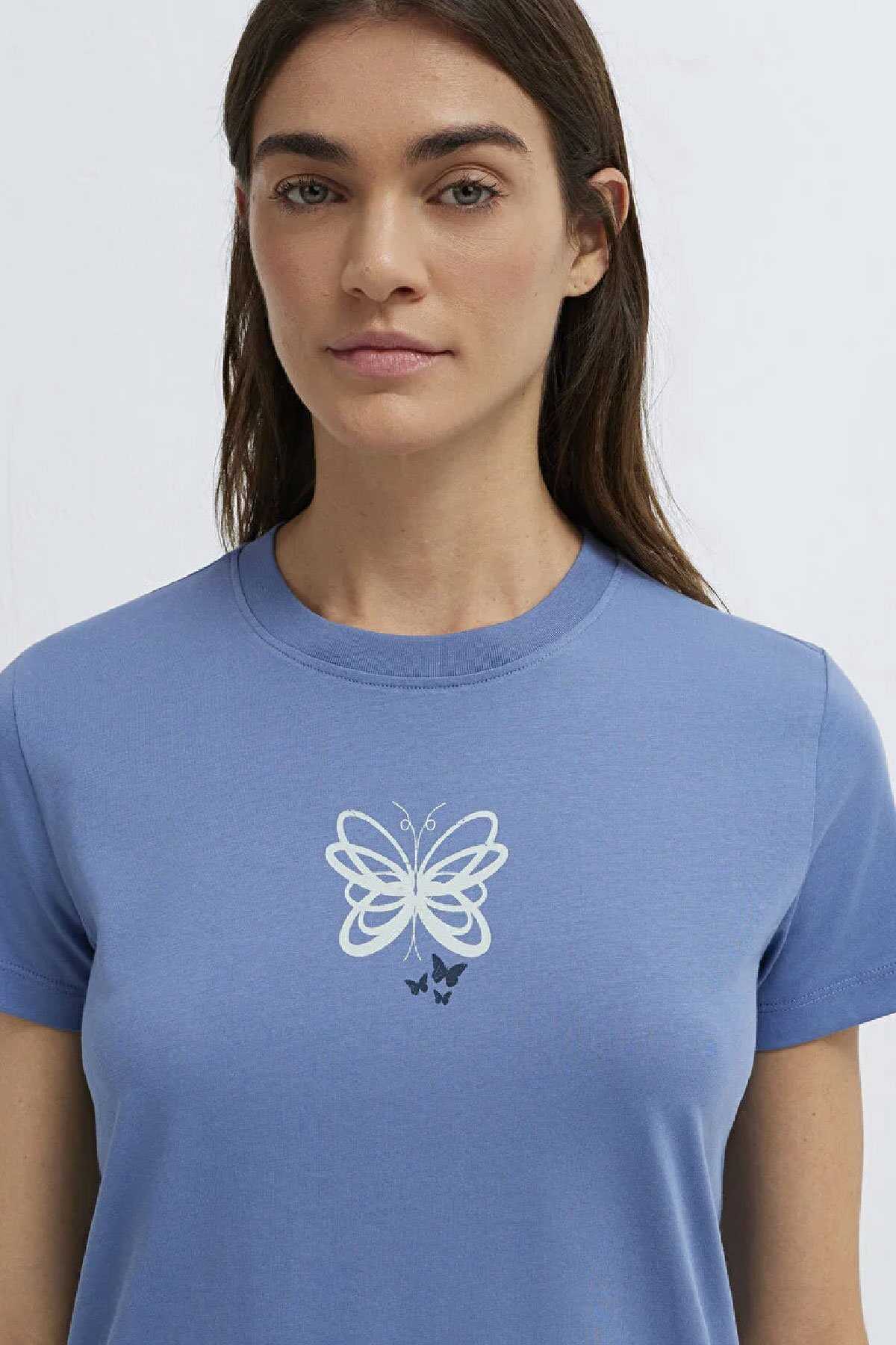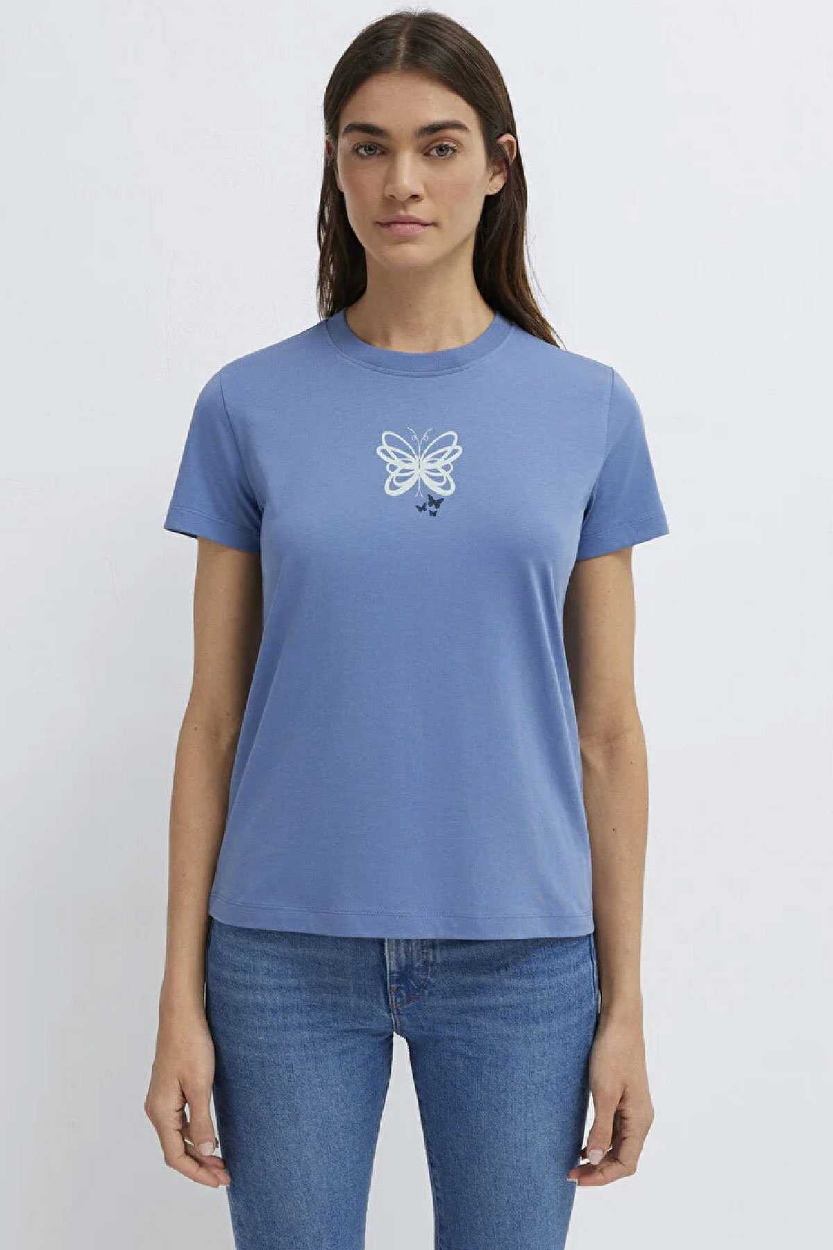Mavi nin kadın koleksiyonundan Kelebek Baskılı Mavi Tişört.-Semi Slim Fit Yarı Dar Kesim-%100 Pamuk-Manken Ölçüleri-Jean: Bel: 26 Boy: 32 Üst: S-Boy: 178 cm Bel: 63 cm Göğüs: 89 cm Kalça: 92 cm-Ürün Kodu: 1613870-70728-Menşei: Mısır