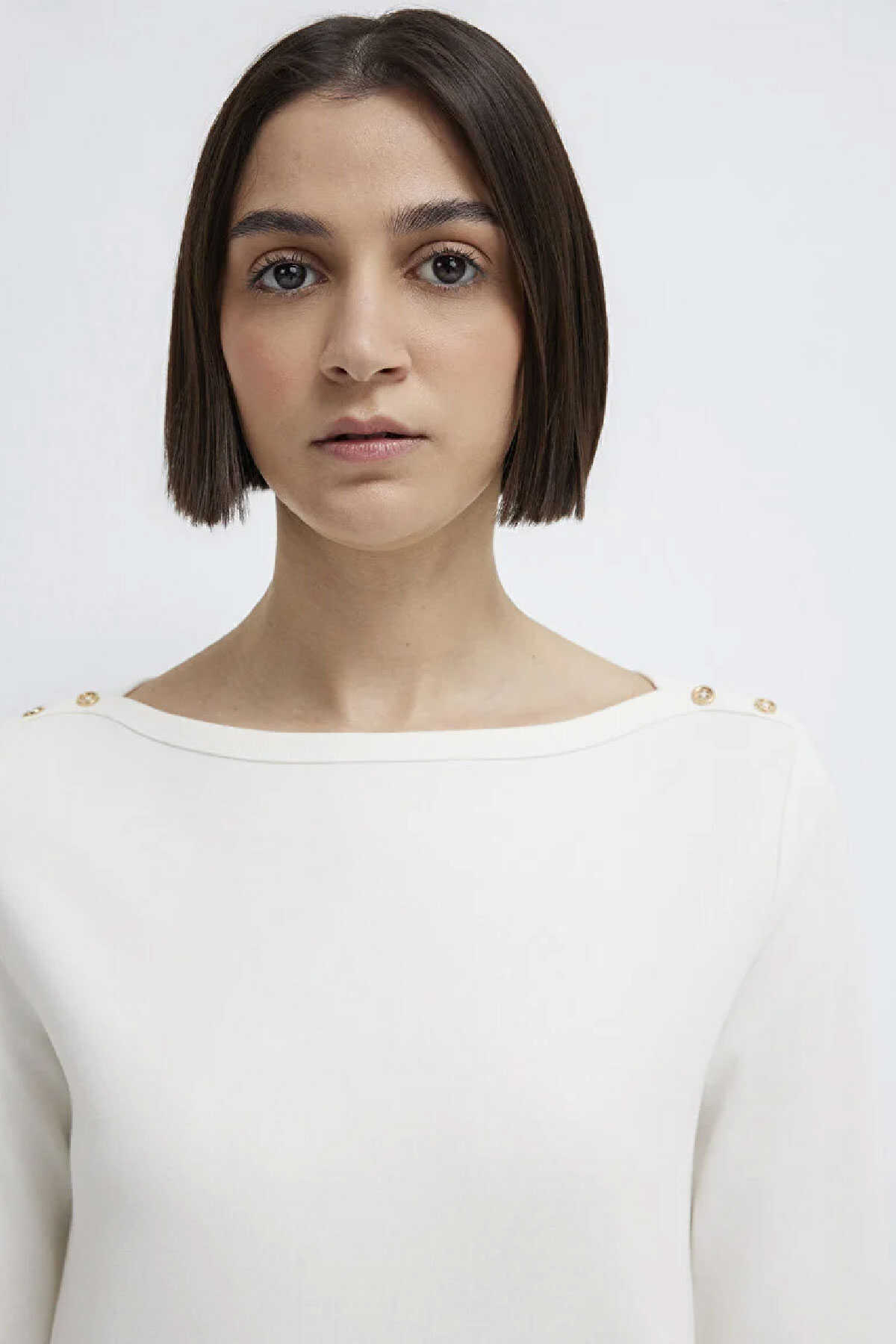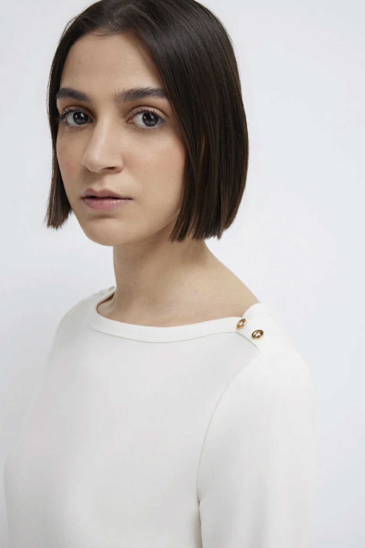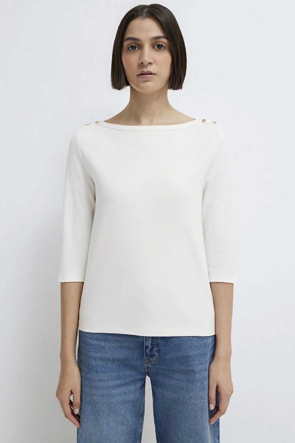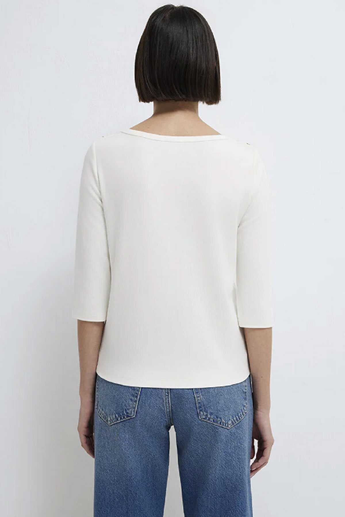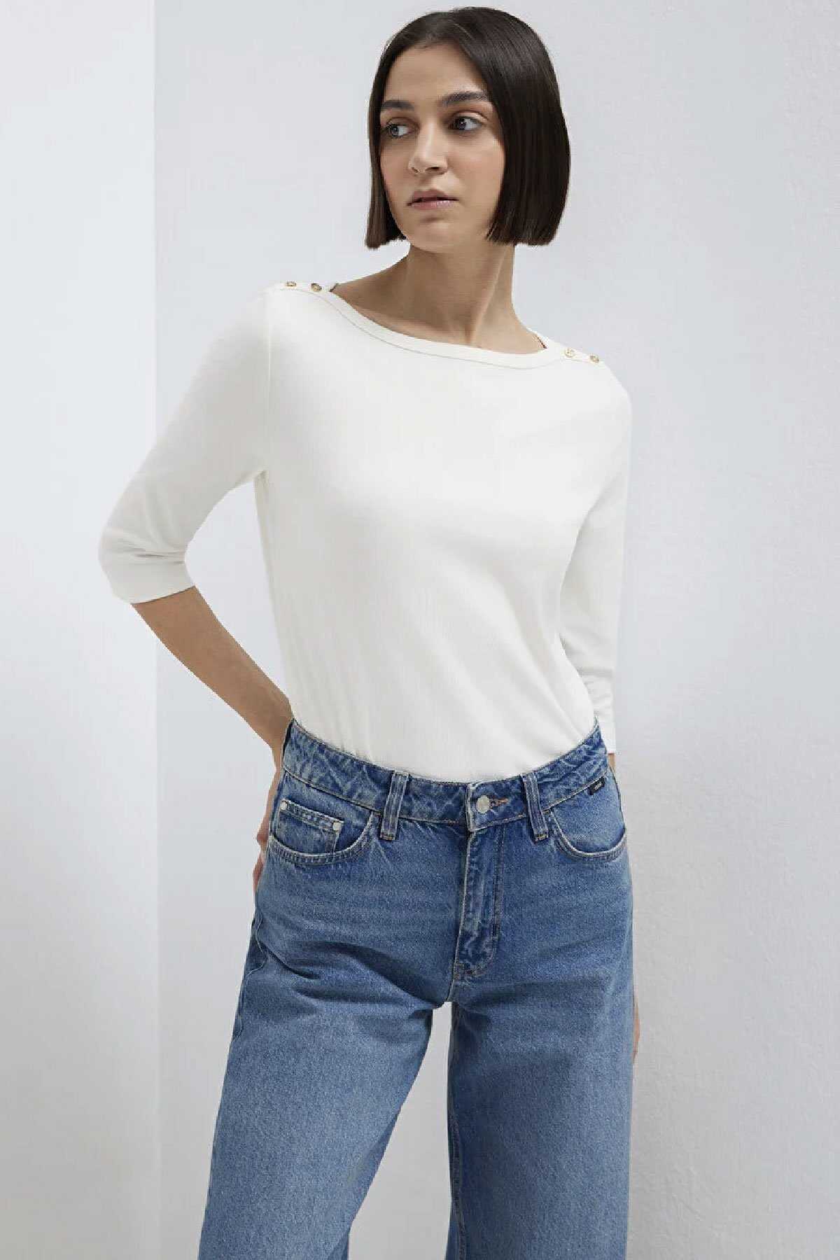 Mavi nin kadın koleksiyonundan Düğme Detaylı Ekru Tişört.-Slim Fit Dar Kesim-Ürün Kodu: 1613760-70057-Kumaş Bilgileri-%93 Pamuk-%7 Elastan-Manken Ölçüleri-Jean: Bel: 26 Boy: 32 Üst: S-Boy: 180 cm Bel: 60 cm Göğüs: 81 cm Kalça: 88 cm-Menşei: Türkiye