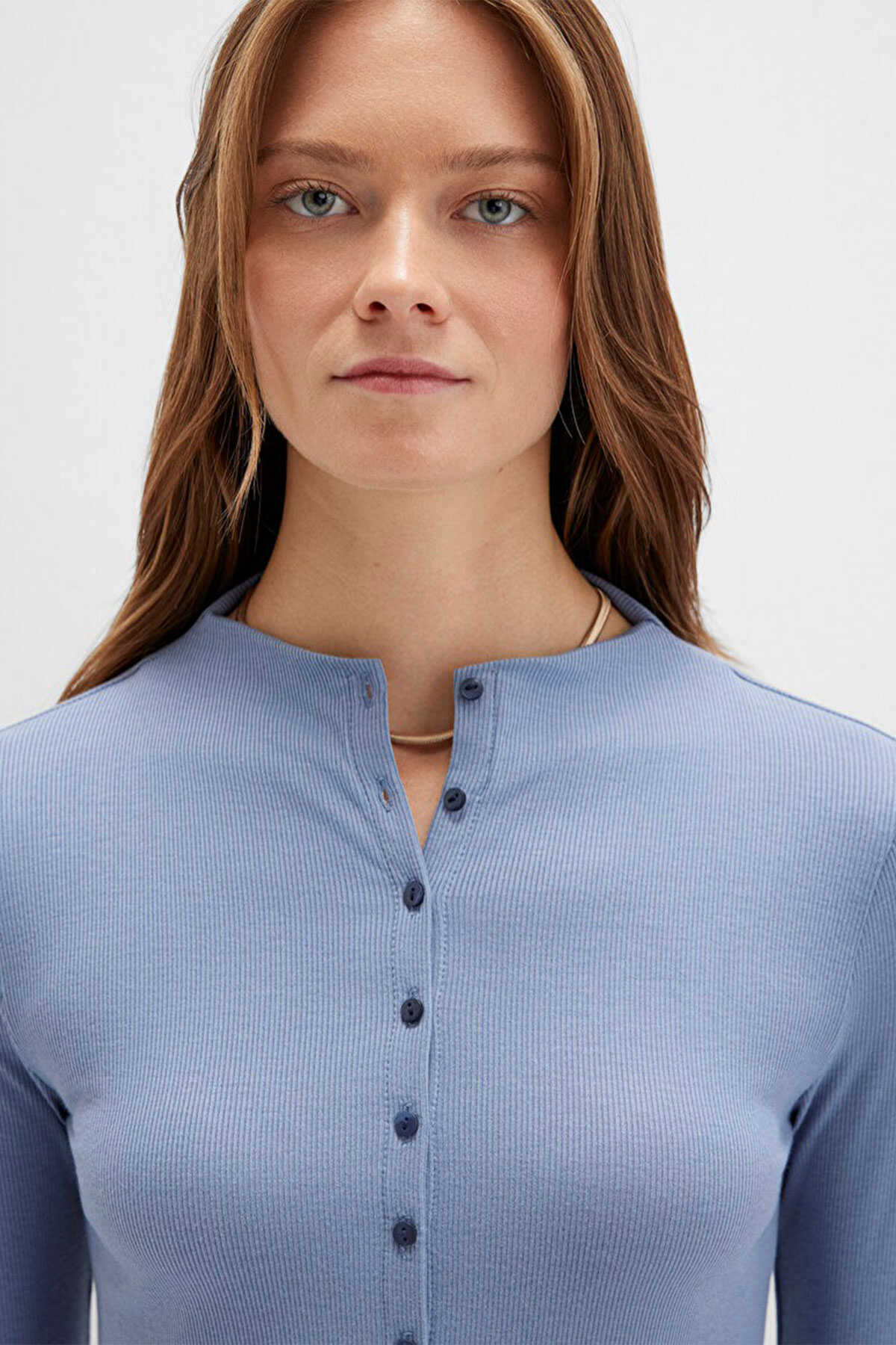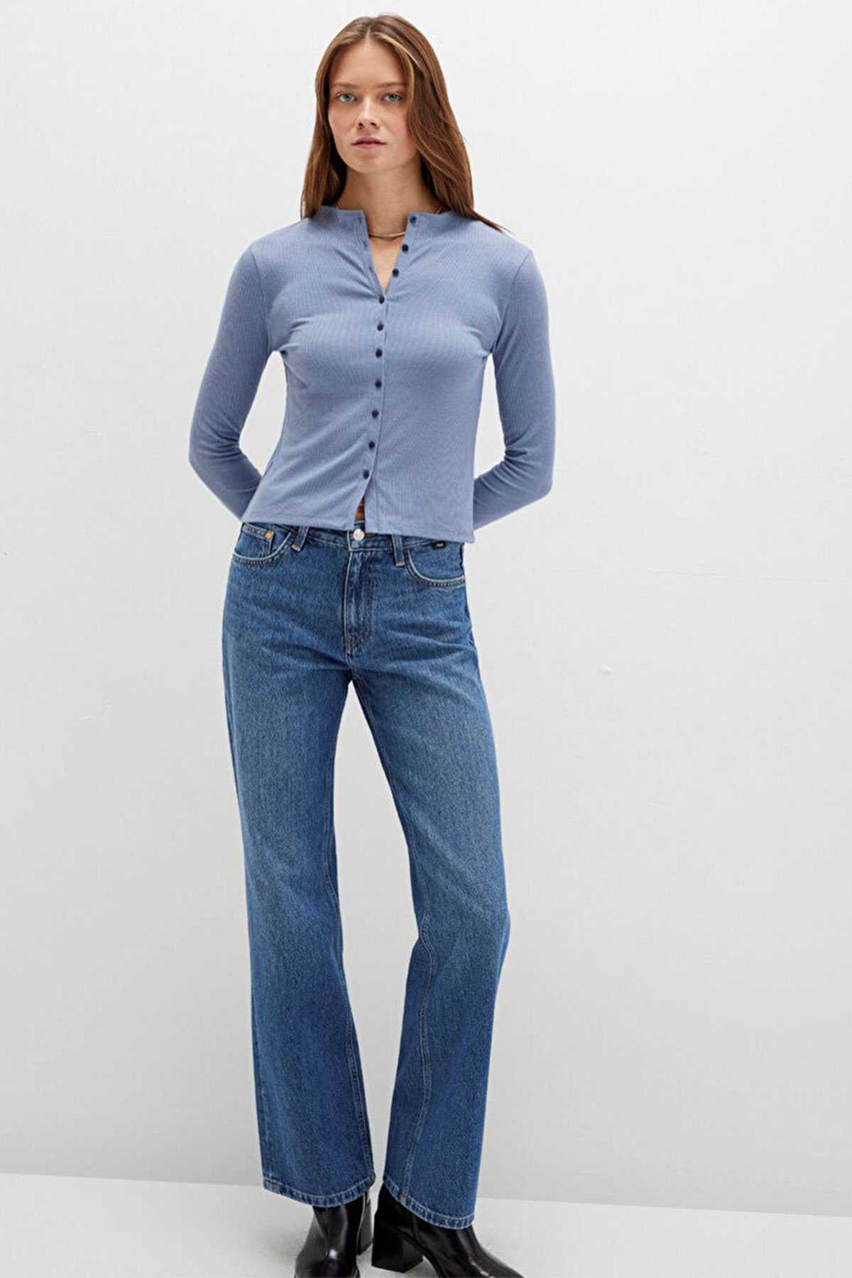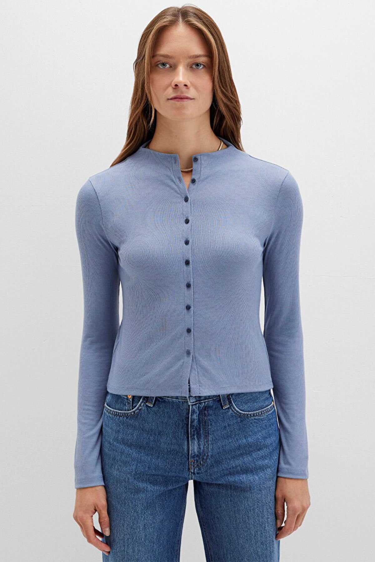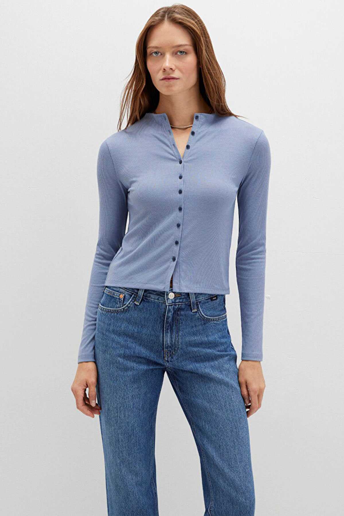 Mavi nin kadın koleksiyonundan Düğme Detaylı Mavi Tişört.-Ürün Kodu: 1613695-86802-Kumaş Bilgileri-%61 Polyester-%35 Viskoz-%4 Elastan-Menşei: Türkiye-