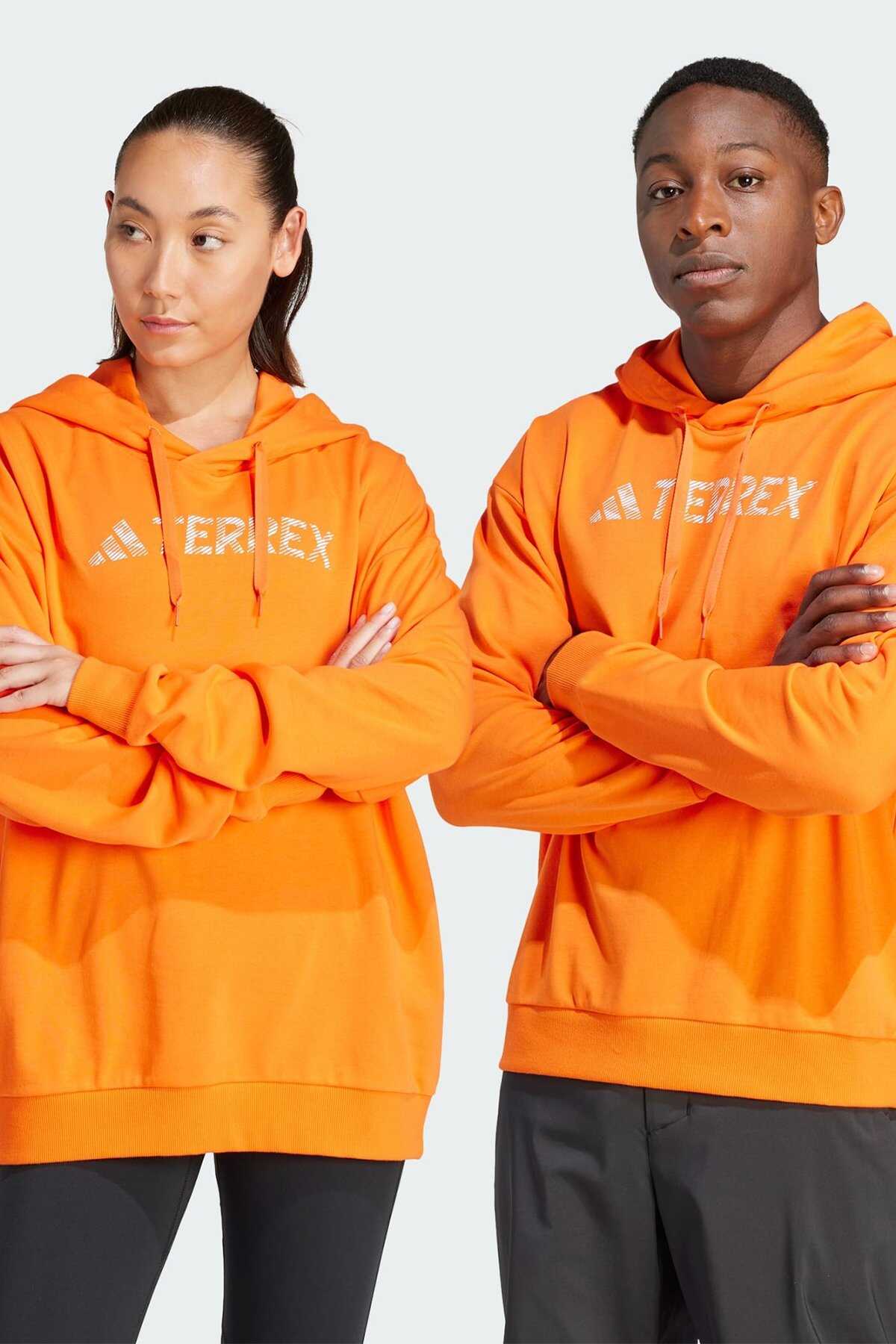 Ayarlanabilir bağcıklı kapüşon-%70 pamuk %30 geri dönüştürülmüş polyester Fransız havlu kumaş-Ribana manşetler ve alt kısım-Özel omuz dikişleri-Deforme Terrex Logosu-Better Cotton ile üretildi-Ürün rengi: Semi Impact Orange-Ürün kodu: HY1708
