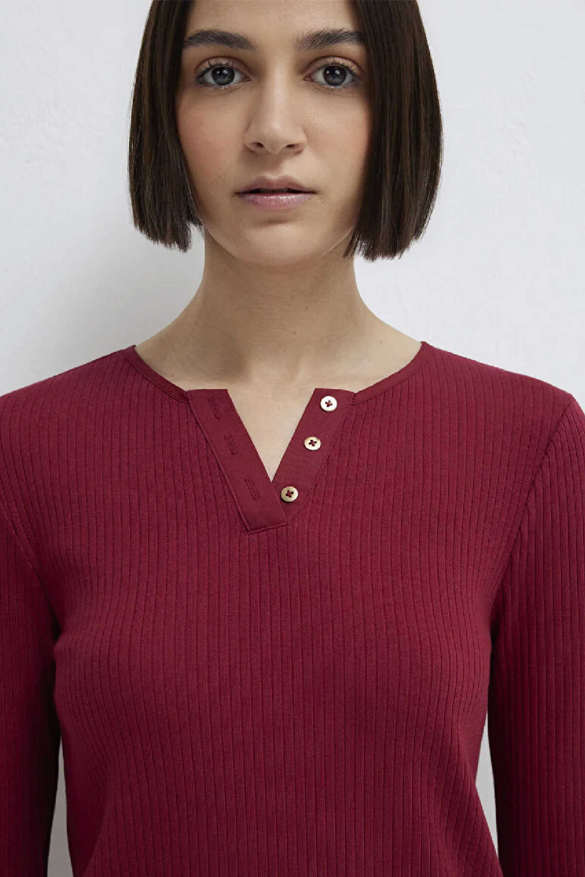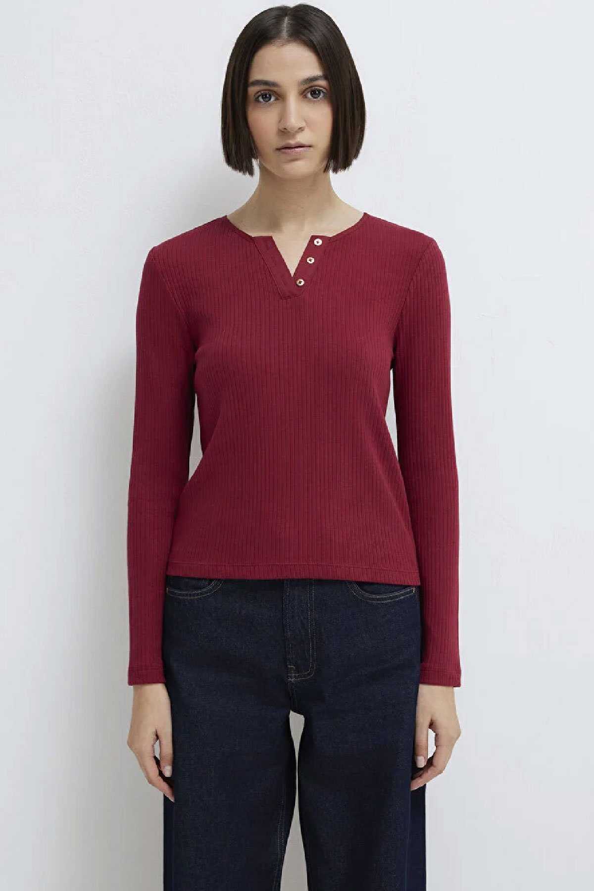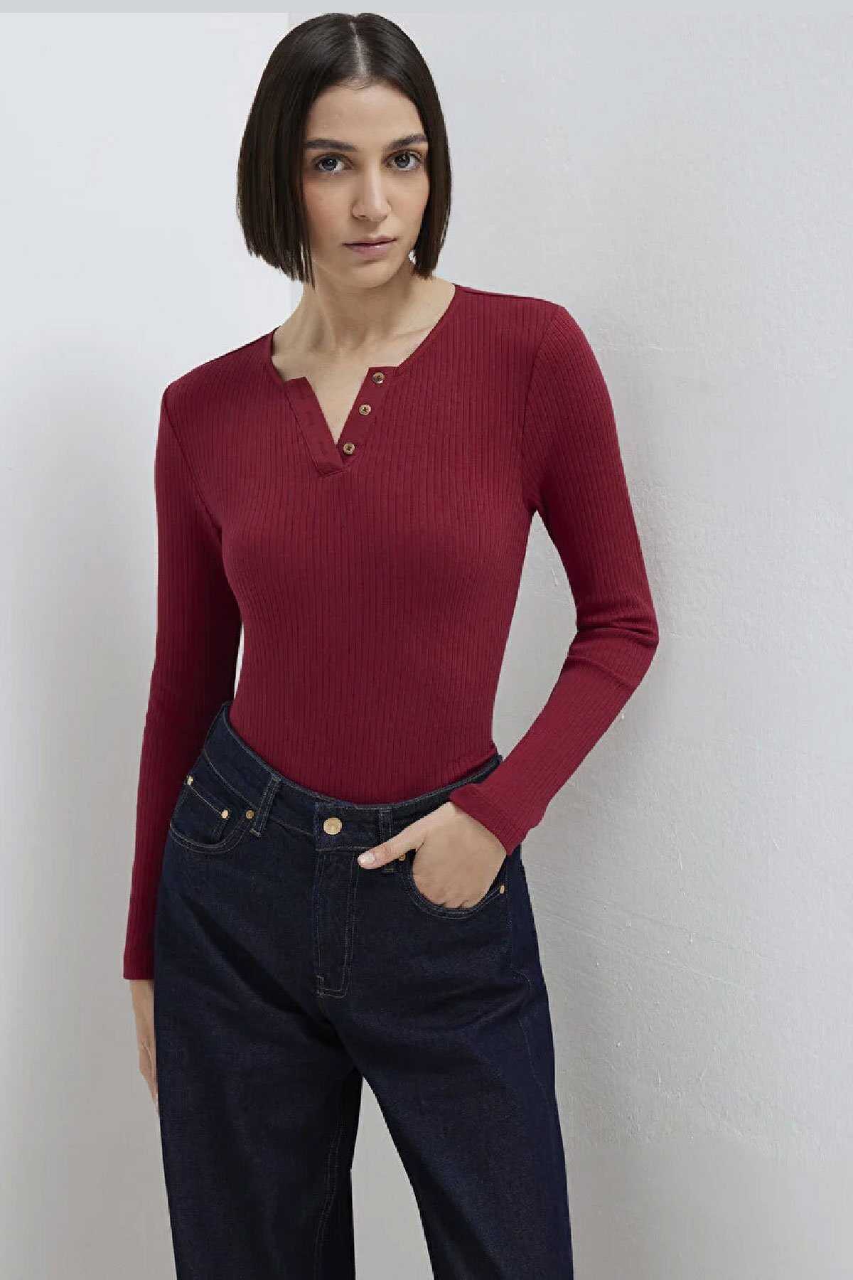 Mavi nin kadın koleksiyonundan Uzun Kollu Düğme Detaylı Kırmızı Tişört.-Ürün Kodu: 1613756-70431-Kumaş Bilgileri-%74 Pamuk-%21 Modal-%5 Elastan-Manken Ölçüleri-Jean: Bel: 26 Boy: 34 Üst: S-Boy: 180 cm Bel: 60 cm Göğüs: 81 cm Kalça: 88 cm-Menşei: Türkiye