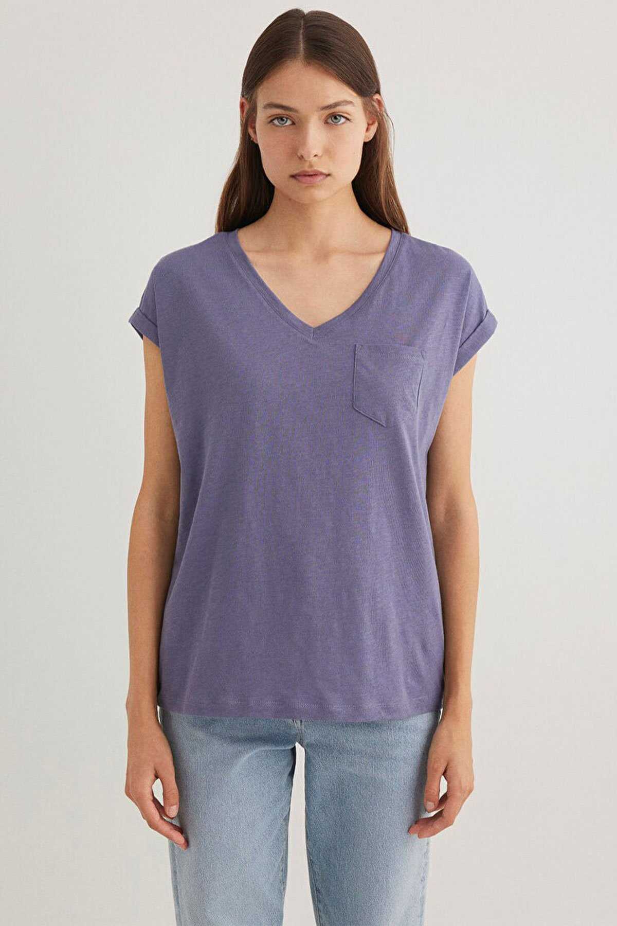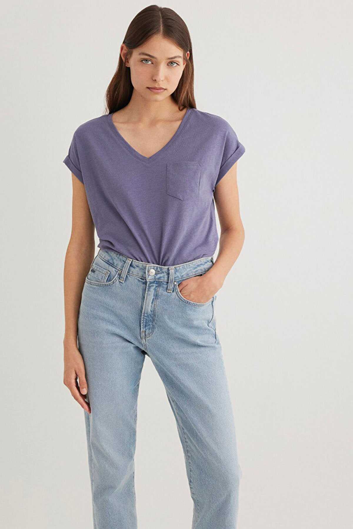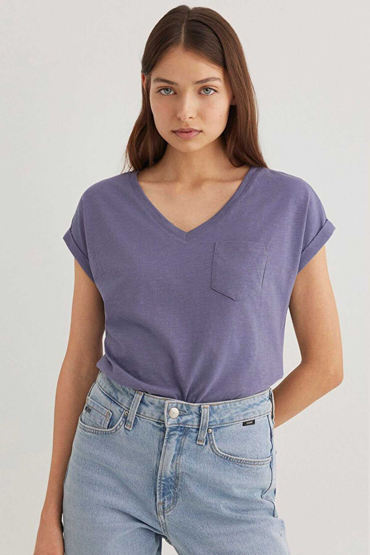 Mavi nin kadın koleksiyonundan V Yaka Mor Tişört-Loose Fit Bol Rahat Kesim-Ürün Kodu: 1600961-70608-Kumaş Bilgileri-%100 Pamuk