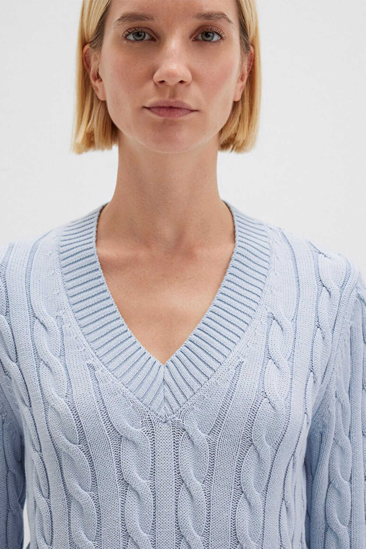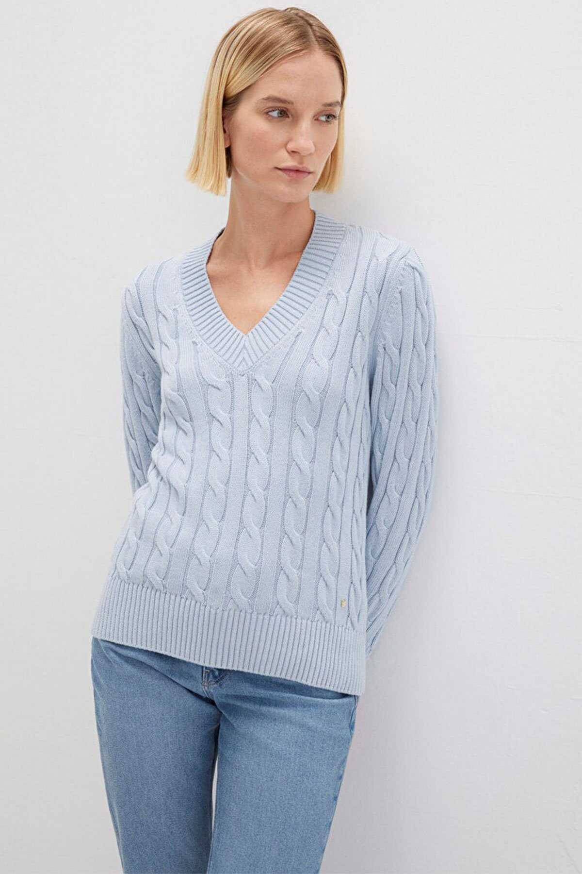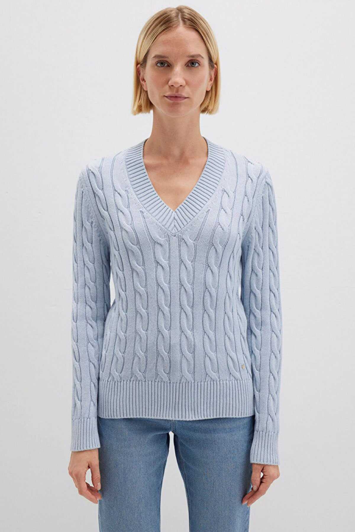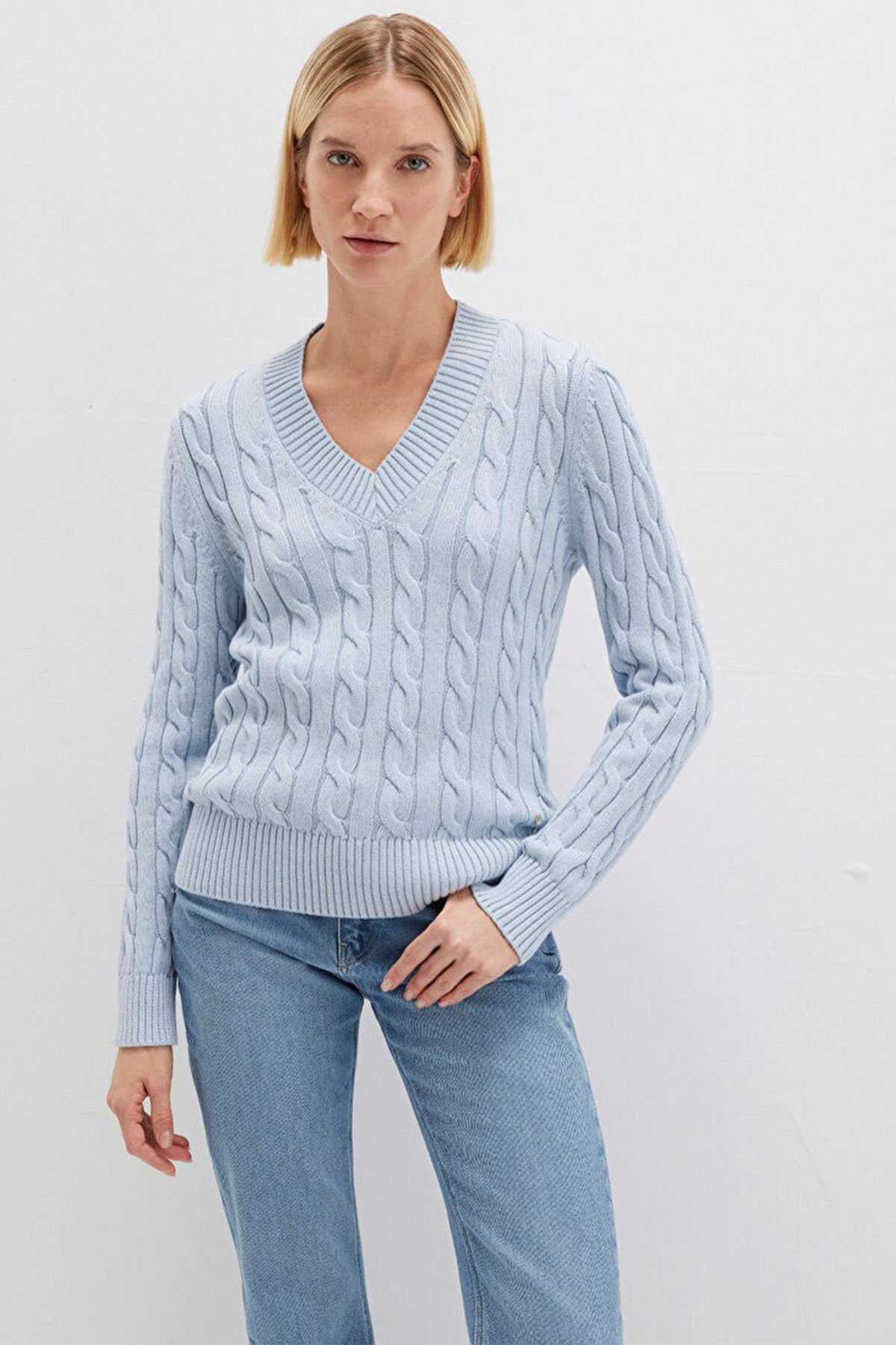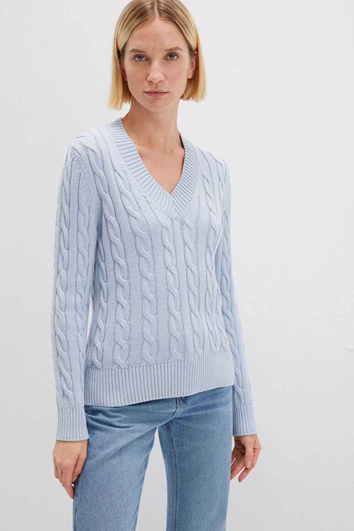 Boy Bilgisi:Standart-Cep Bilgisi:Cepsiz-Desen:Yumuşak Dokulu-Kalıp Bilgisi:Slim Fit-Kol Bilgisi:Uzun-Materyal:%95 Pamuk %5 İpek-Menşei:Türkiye-Cinsiyet:Kadın-Ürün AçıklamasıMavi Bebe Mavisi Kadın V Yaka Slim Fit Yumuşak Dokulu Kazak modern ve şık bir görünüm arayan kadınlar için mükemmel bir tercih sunuyor.- İnce detaylarıyla dikkat çeken bu kazak slim fit kalıbı sayesinde vücut hatlarını zarifçe sararak feminen bir siluet oluşturur. -Uzun kolları ve V yaka tasarımı ile hem rahatlık hem de şıklığı aynı anda yaşatır. Yumuşak dokusu sayesinde gün boyu konforlu hissetmenizi sağlayan bu parça özellikle bahar aylarında hafif katmanlı kombinler için idealdir. -Bebe mavisi rengi ise taze ve canlı bir hava katar; farklı tonlarla kolayca uyum sağlar.- Bu kazakı yüksek bel pantolon veya eteklerle kombinleyerek ofis stilinizi tamamlayabilir ya da günlük gezintilerinizde rahatlıkla kullanabilirsiniz. -Aksesuar seçiminde ise minimal takılarla sade ama etkileyici görünümler elde edebilirsiniz; ince zincir kolyeler veya zarif küpelerle kombininizi zenginleştirmek harika olur! -Ayrıca beyaz spor ayakkabılar ya da topuklu botlarla farklı stiller yaratmak mümkün. -Bu eşsiz parçayı dolabınıza eklemek için acele edin! -Şıklığınızı ön plana çıkaracak Mavi Bebe Mavisi Kadın Kazak sizi bekliyor!-Menşei: Türkiye-