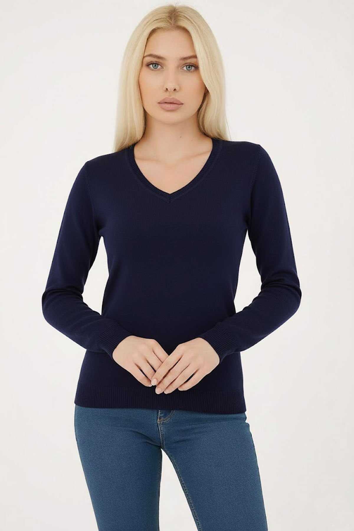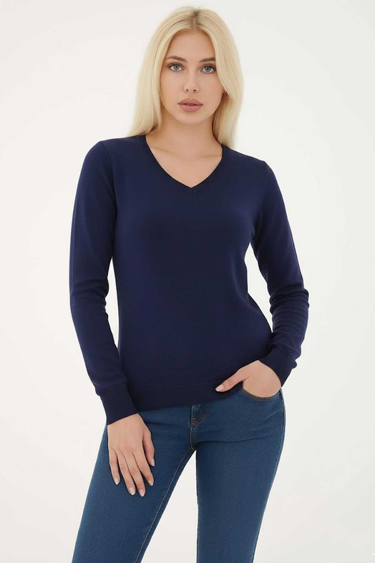 Kadın V Yaka Kazak 25K0778K1 Lacivert
