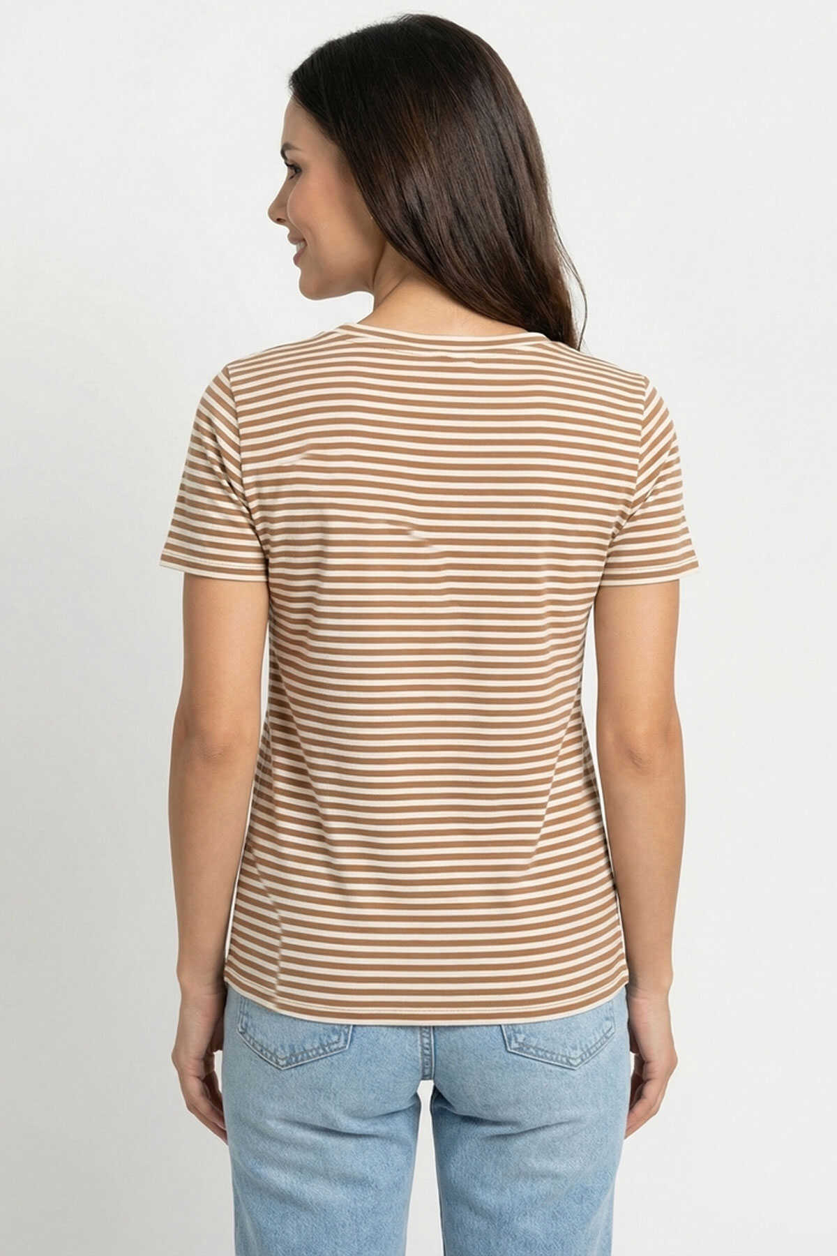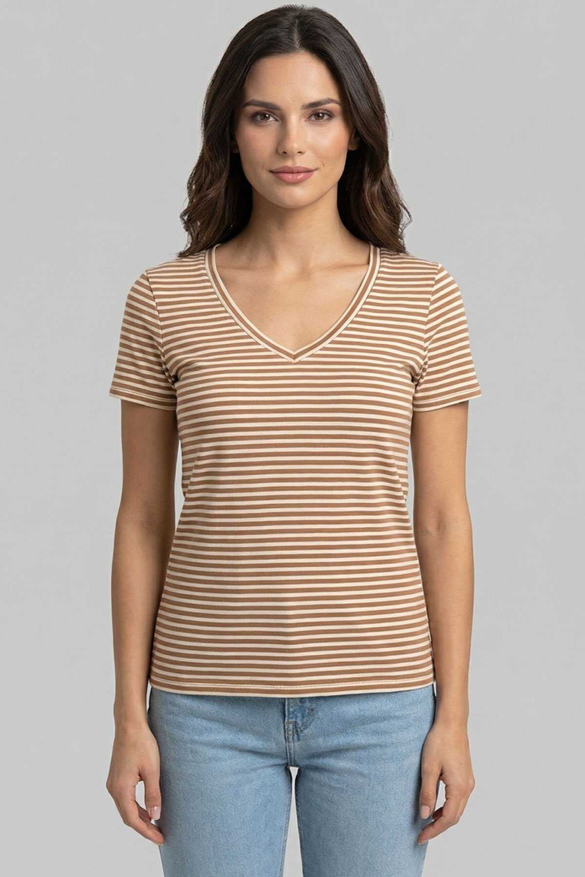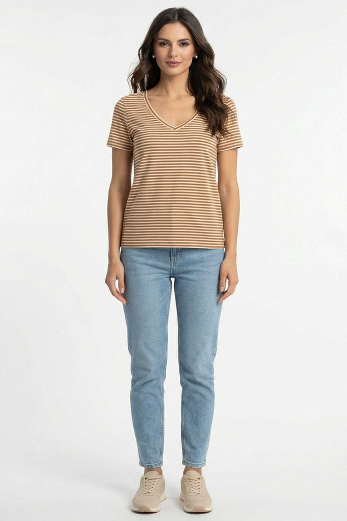 Ürün Tipi: Tişört-Yaka: V Yaka-Kol: Kısa Kollu-Kesim: Normal Kesim-Cinsiyet: Kadın-Üretim Şekli: Yuvarlak Örme-Üretim Detayı: Tek Katlı Jarse-Bileşim: %90 Pamuk %5 Elastan %5 Metalik Elyaf-Menşei: Bangladeş