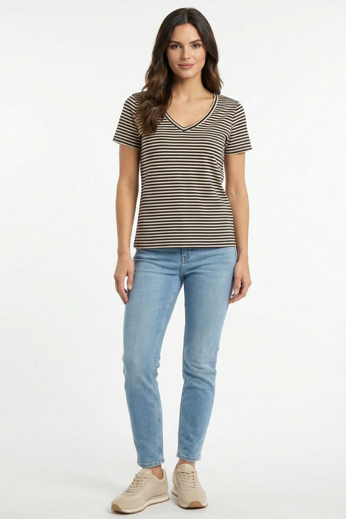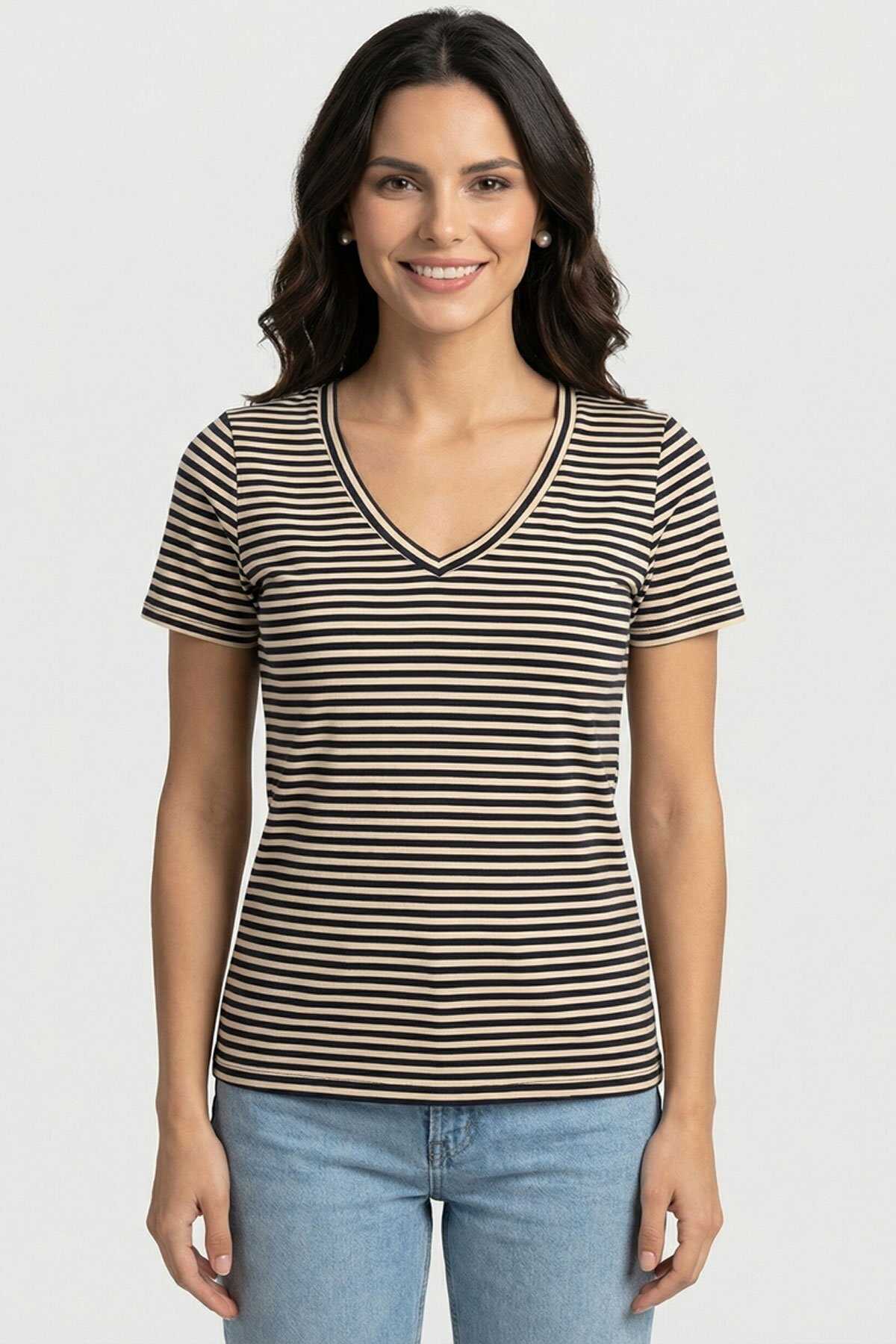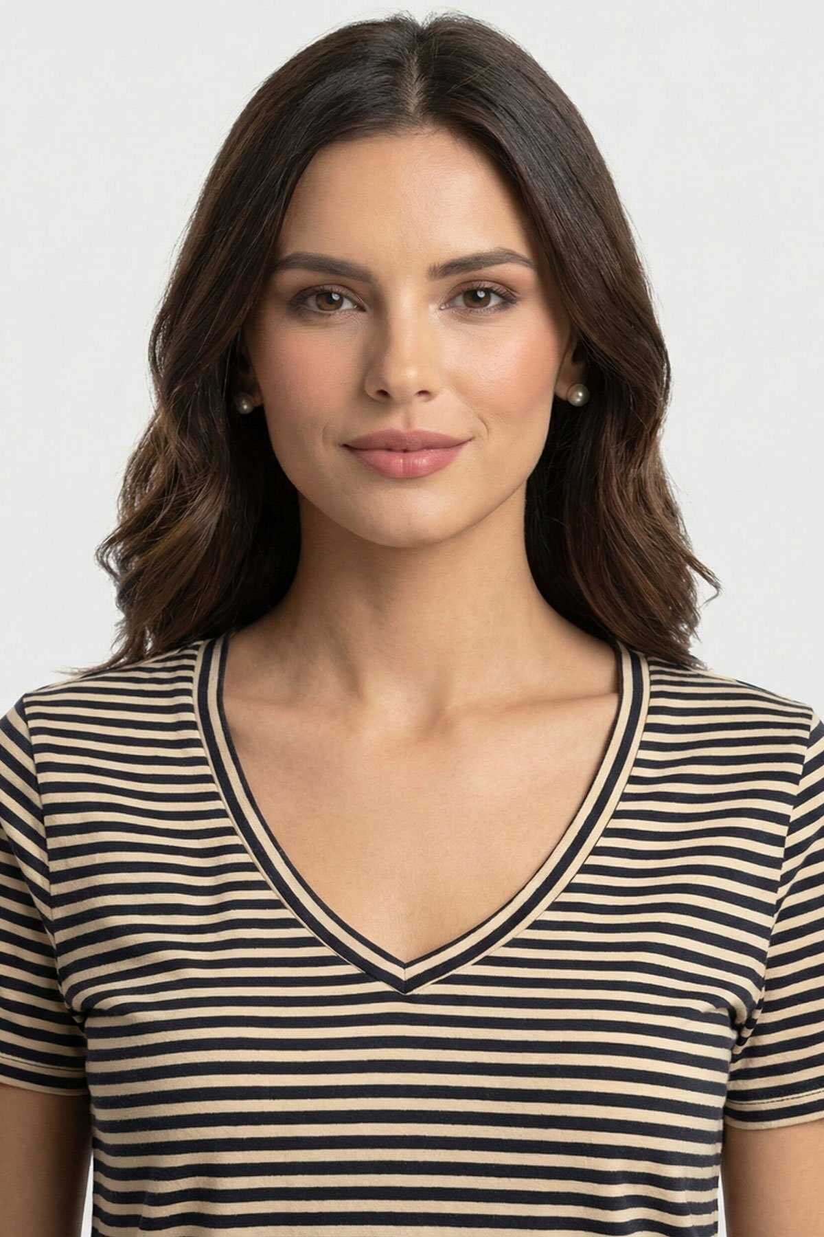 Ürün Tipi: Tişört-Yaka: V Yaka-Kol: Kısa Kollu-Kesim: Normal Kesim-Cinsiyet: Kadın-Üretim Şekli: Yuvarlak Örme-Üretim Detayı: Tek Katlı Jarse-Bileşim: %90 Pamuk %5 Elastan %5 Metalik Elyaf-Menşei: Bangladeş