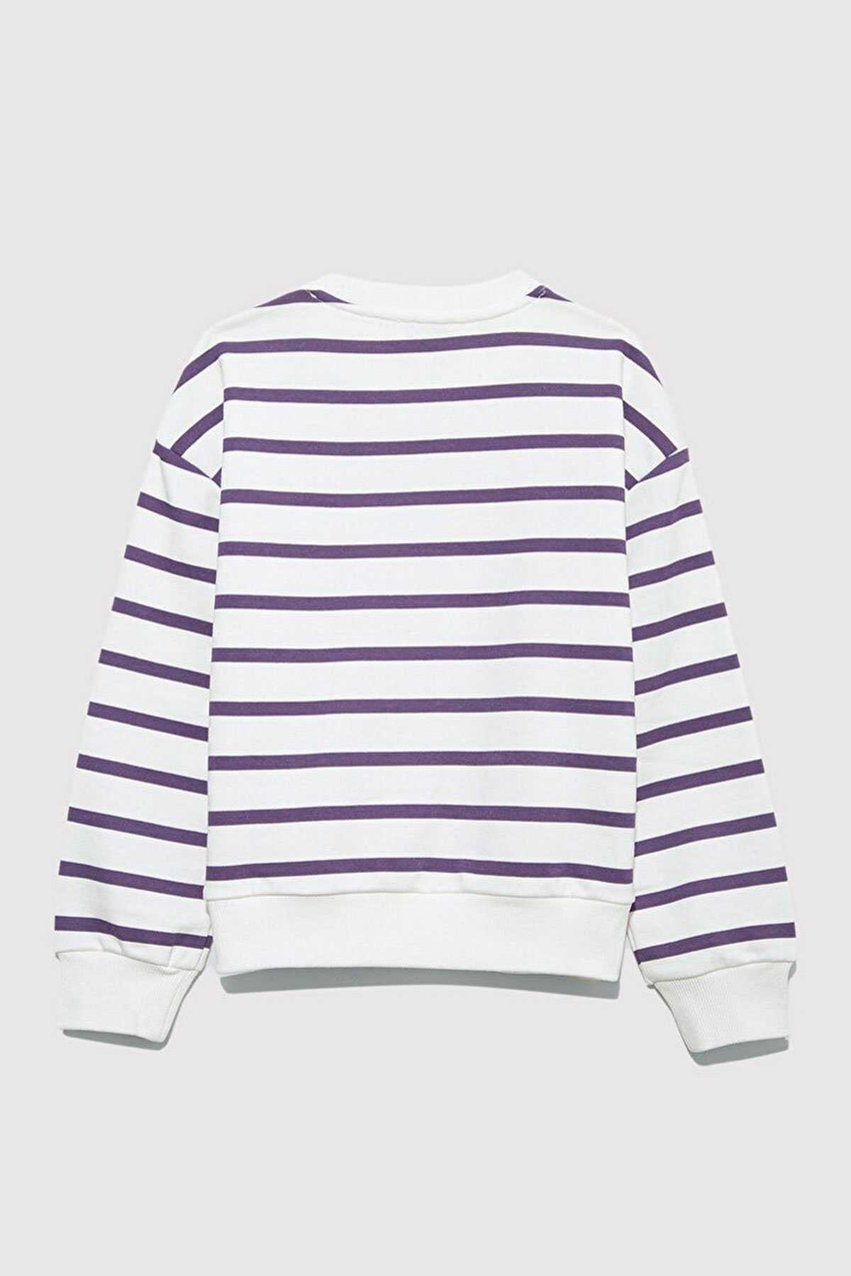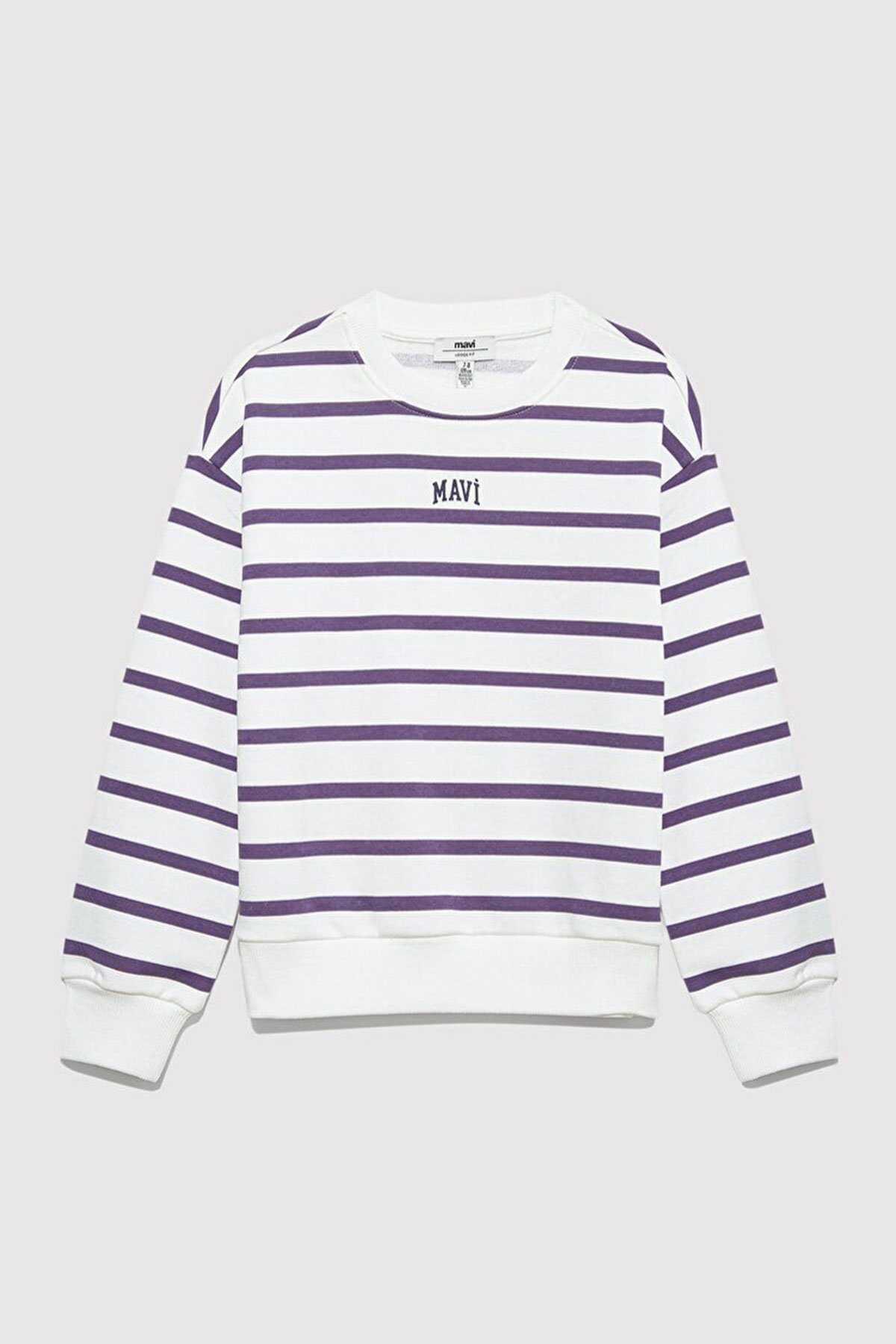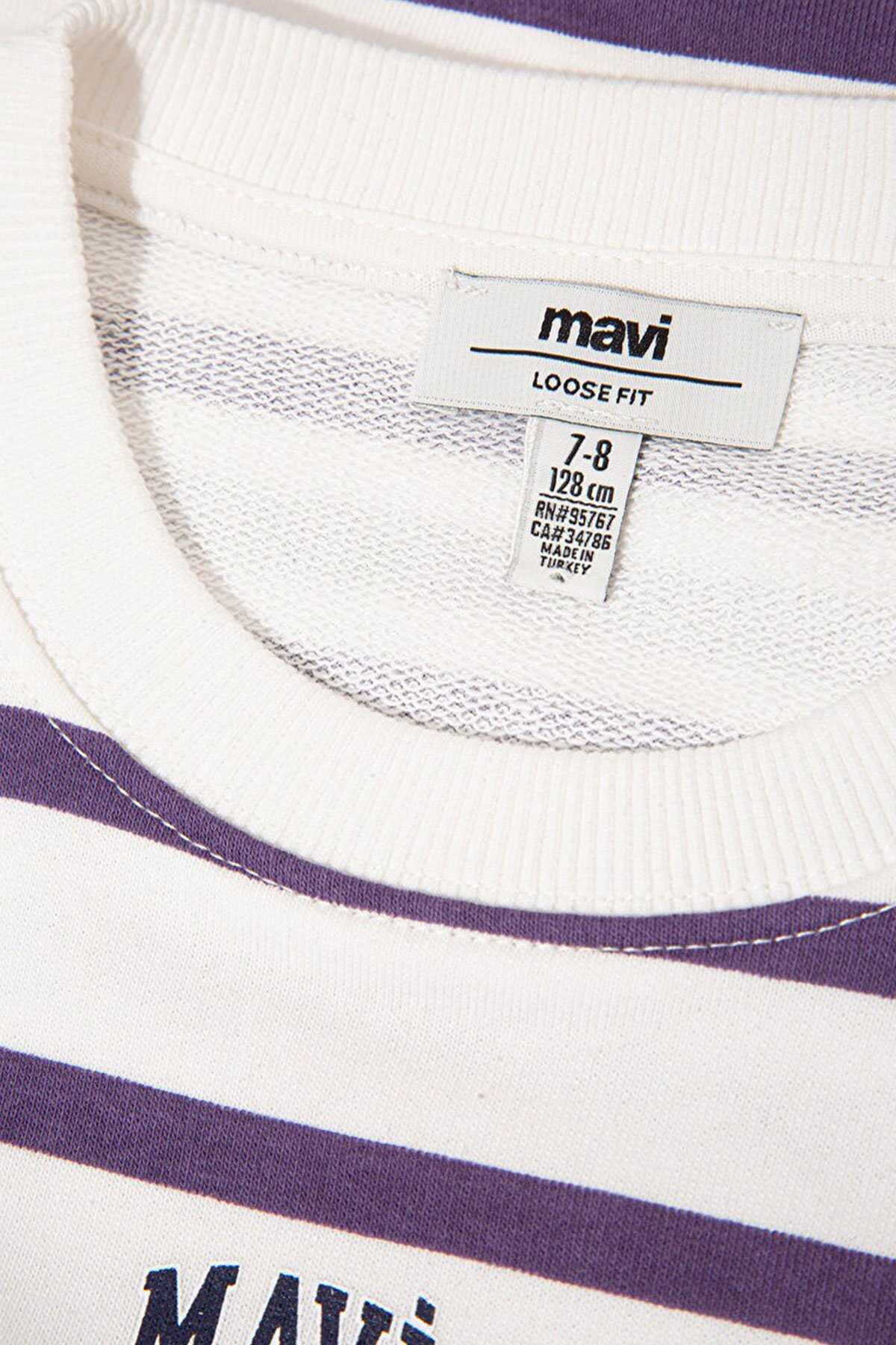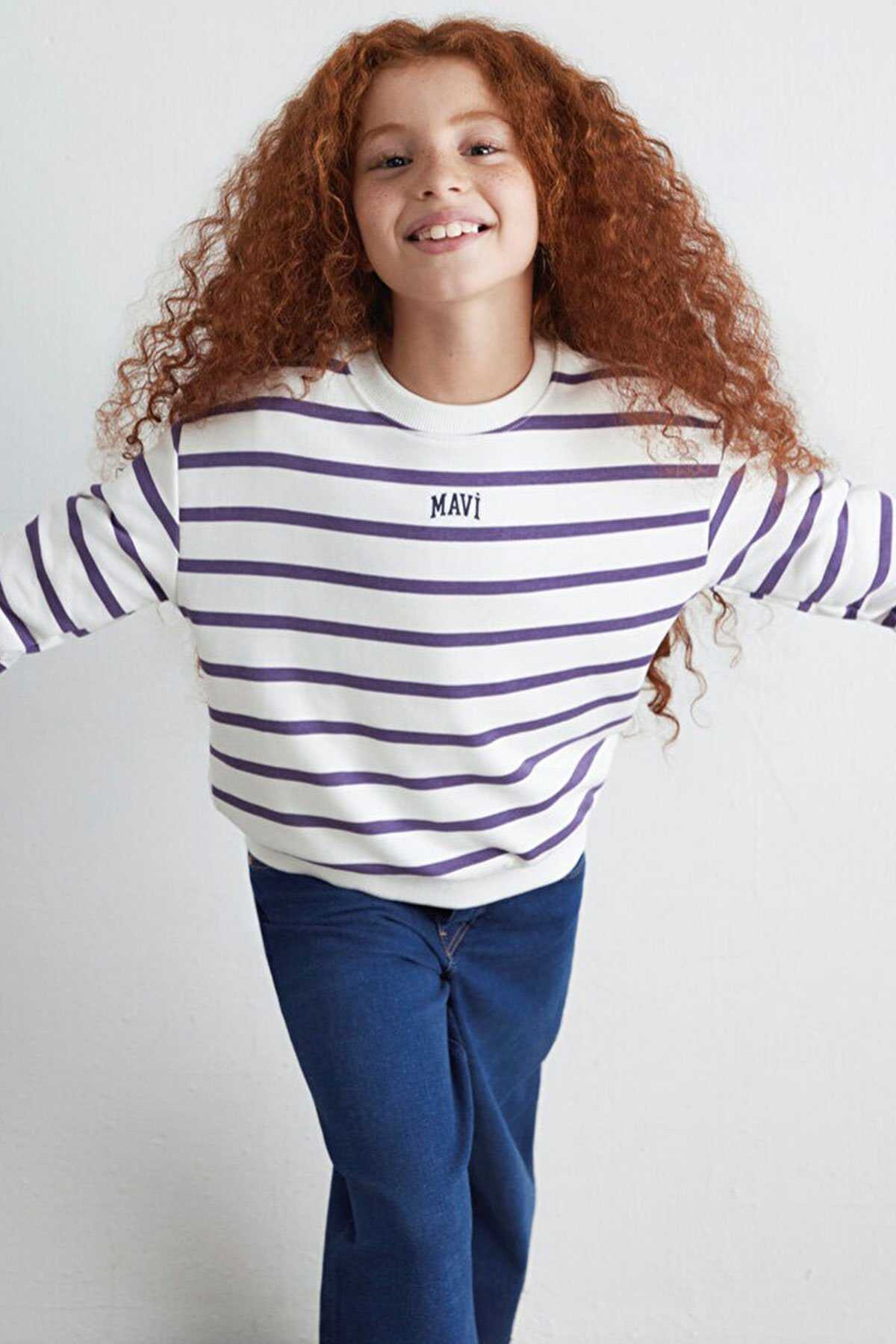 Mavi nin kız çocuk koleksiyonundan Mavi Logo Baskılı Mor Çizgili Sweatshirt.-Ürün Kodu: 7S10038-88138-Kumaş Bilgileri-%66 Pamuk-%34 Polyester-Manken Ölçüleri-Jean: Bel: 7-8 Yaş Üst: 7-8 Yaş-Menşei:Türkiye